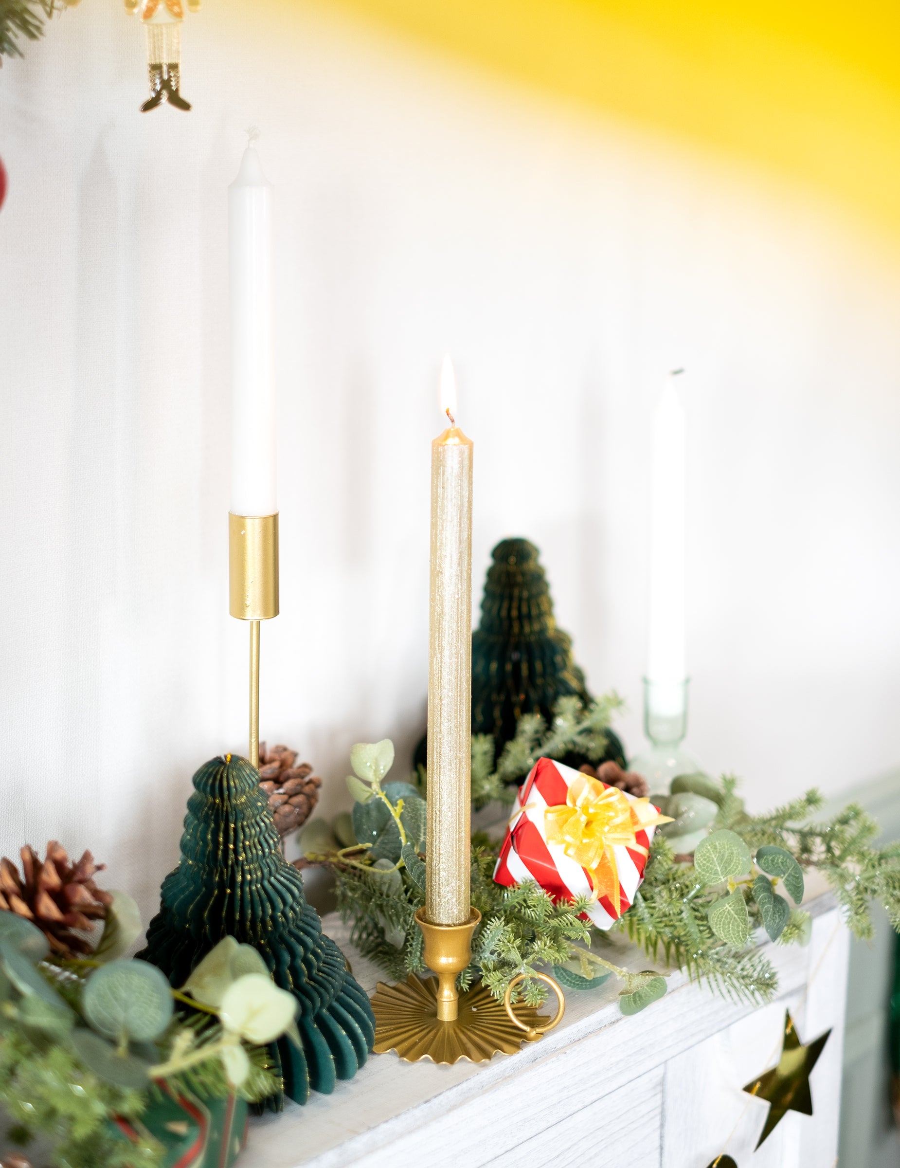Ce lot propose 4 bougies en cire d'une hauteur de 25 cm pour illuminer vos festivités. L'ensemble comprend 2 chandelles cylindriques traditionnelles et 2 modèles torsadés originaux. Toutes sont habillées d'un coloris or scintillant et de paillettes fines. Elles apporteront une note luxueuse à votre décoration de Noël ou à un événement sur le thème chic .
