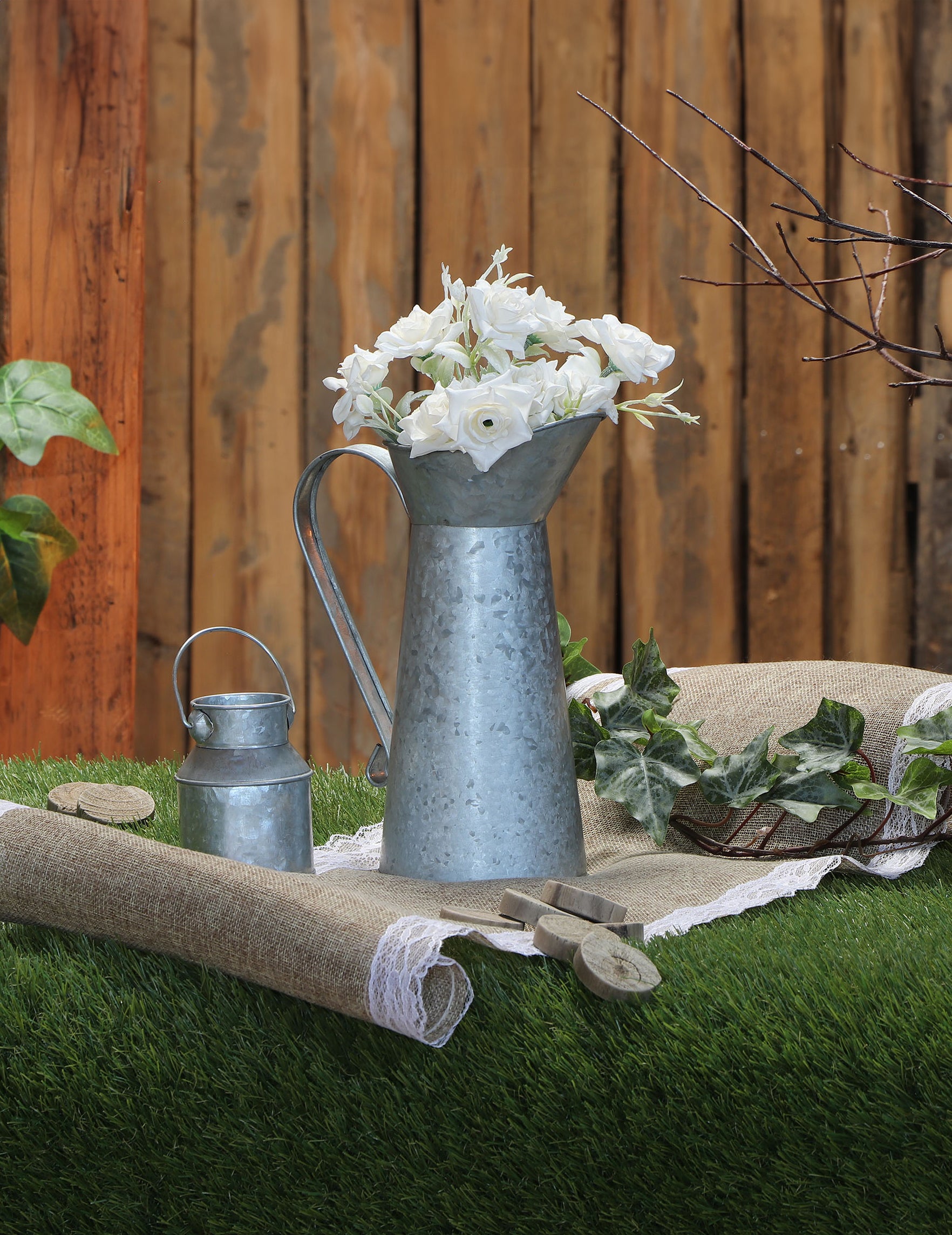 Придайте автентичен, ретро стил на вашето събитие с това кана за мляко с винтидж дизайн. Изработена от сив цинк със състарен вид, тази цинкова кана мярка 18 cm височина за 12 cm Широк е и има удобна дръжка. Идеален за ретро сватба Независимо дали предпочитате рустик или кънтри стил, тя може да служи като ваза за вашите сухи цветя или сезонни букети. Персонализирайте това винтидж лейка с маркер или тебешир или добавете дантелена панделка за допълнителна мекота. винтидж кана за мляко е перфектният аксесоар за създаване на уникален централен елемент и подобряване на вашия сватбена украса.
