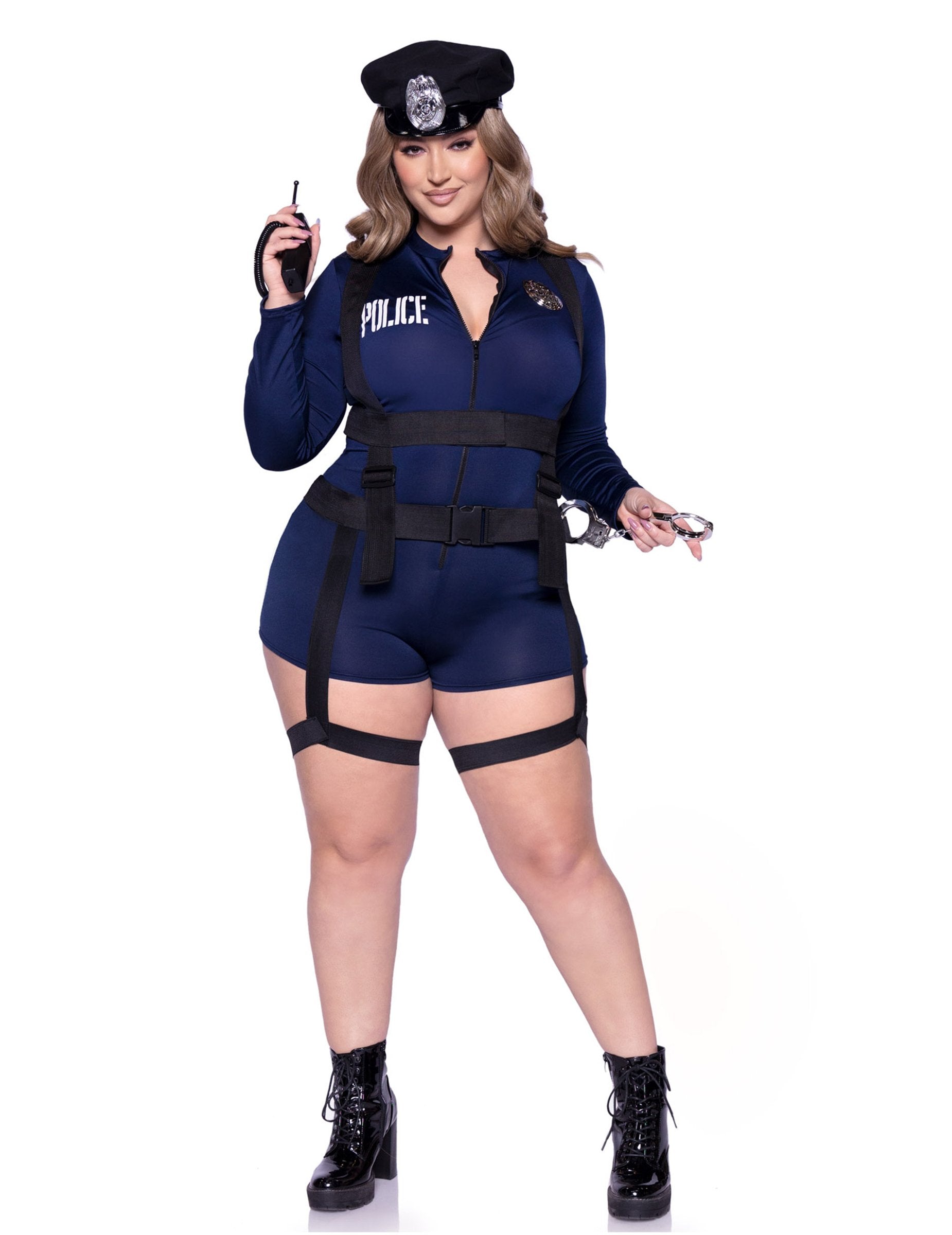 Този полицейски костюм е за жени и се състои от комбиниран, сбруя на тялото, значка, шапка, фалшива токи-война и чифт белезници. Compishort е с дълъг -по -синьо и синьо на цвят. Тя има регистрацията на "полицията" в бяло писмо на гърдите. Той има цип, който да го постави лесно, както и черни ленти. Шапката е тъмно оцветена шапка, украсена със сребърна полицейска значка. Облеклото се допълва от полицейска значка, фалшива токи-война и чифт белезници. Този секси полицейски костюм ще бъде идеален за вашата Свети Валентин вечер или по случай Нова година!