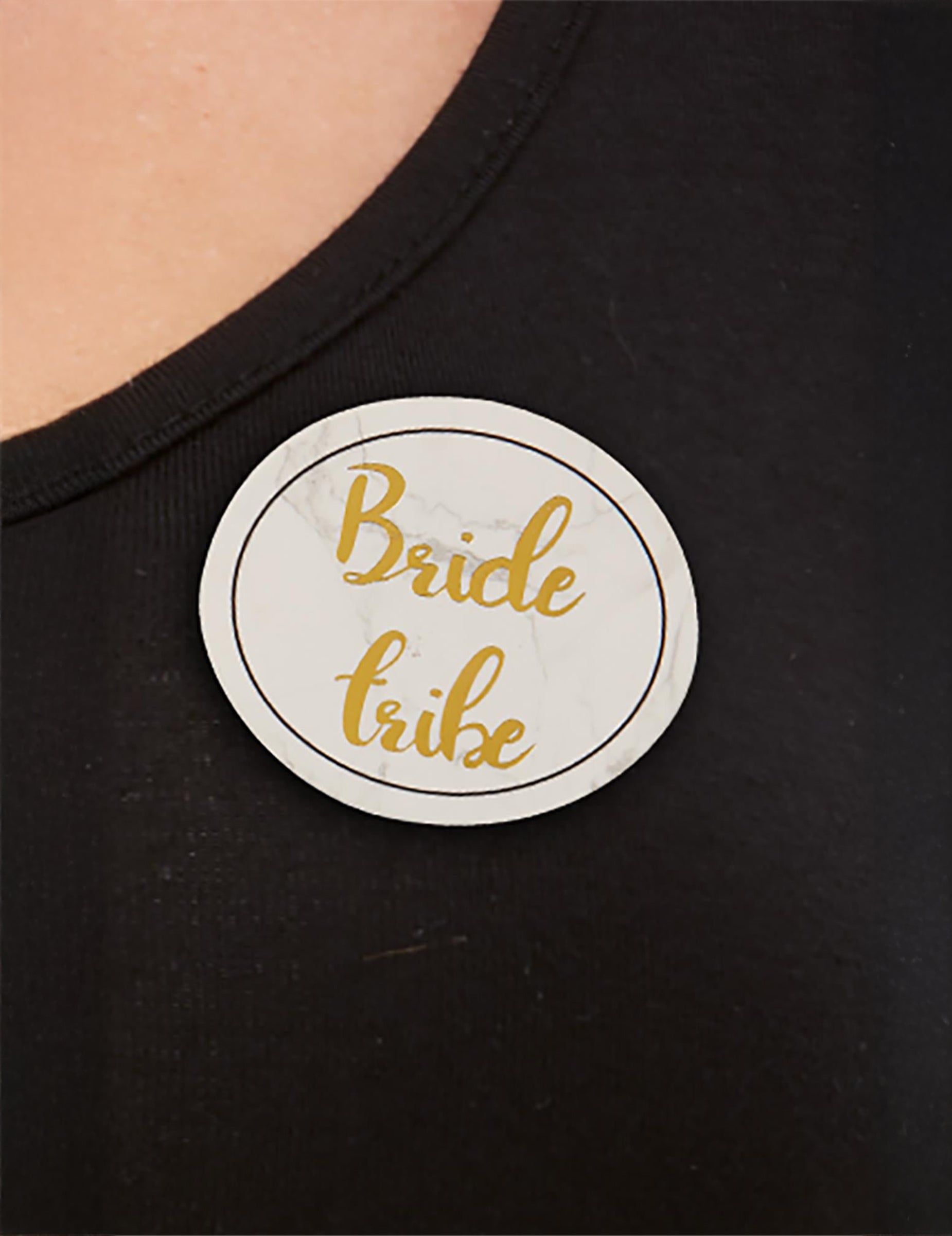 Тези значки са бели и имат надписи със златни букви "Бъдеща булка"на едно и"Племе на булката„относно останалите четирима.“
