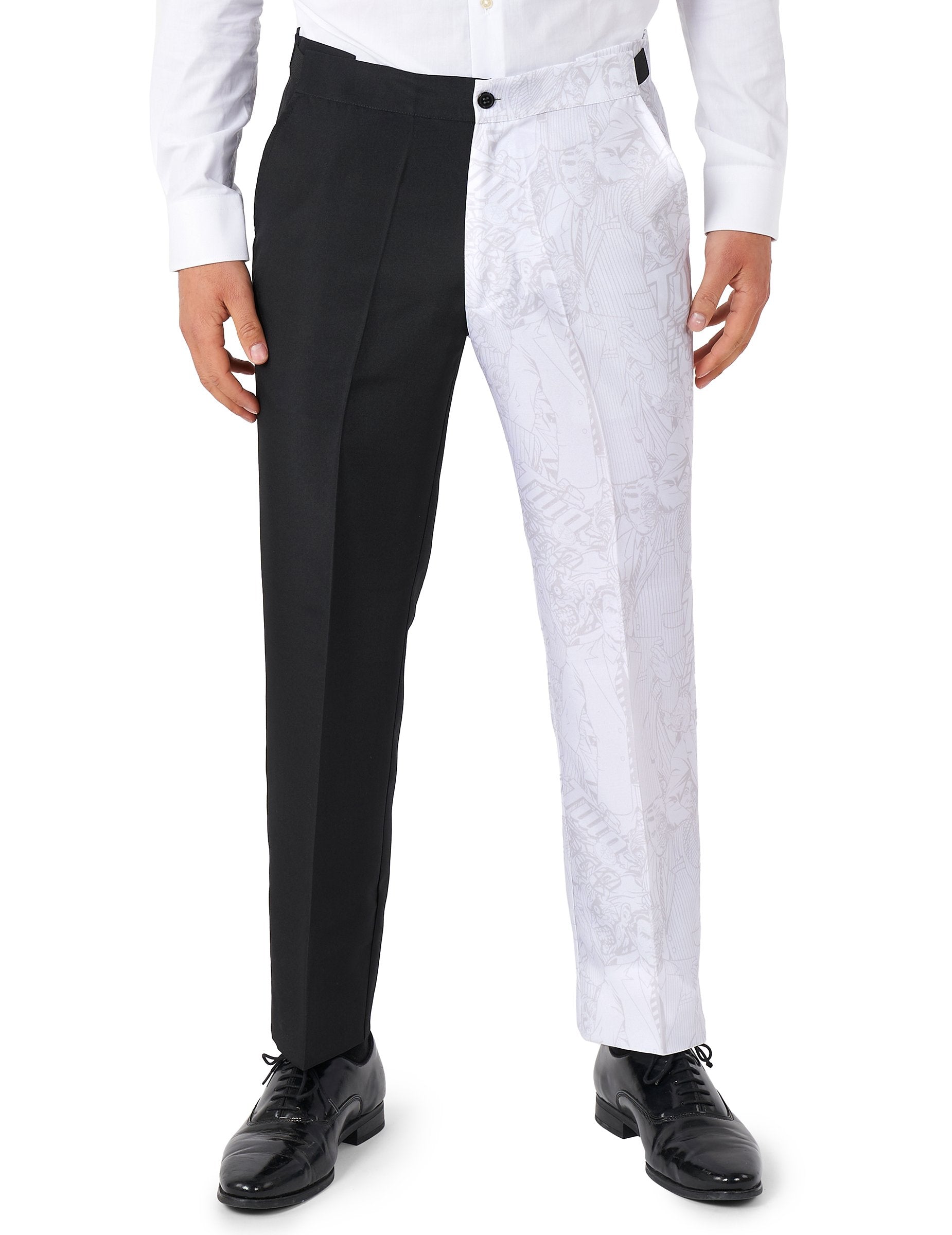 Тази двойна маскировка за възрастни е под официален лиценз за следване. Тя включва яке, панталони и вратовръзка. Костюмното яке има оригиналната характеристика да бъде в два различни цвята: черно от дясната страна и бяло от лявата страна. Следователно ще намерите и от лявата страна на белите, ремаркета на Жокера. Панталоните и вратовръзката имат същите характеристики като якето на костюма. Този двоен костюм ще бъде идеален за усъвършенстване на вашата Хелоуин или Карнавална вечер!