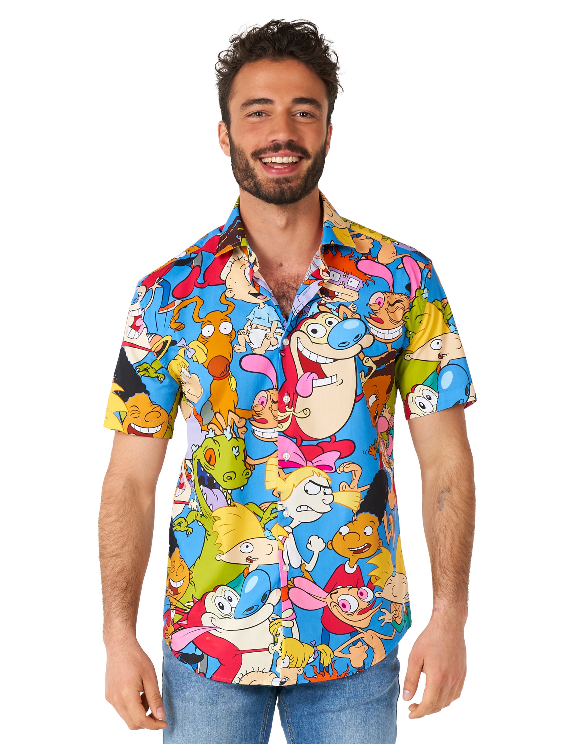 Тази карикатура на 90 -те е за възрастни. Под официален лиценз за противоположност тя е на къса и е отпечатана с известните карикатури от канала Nickelodeon като Hé Arnold! Или Razmoket. Той се затваря с помощта на бял бутон на предния поток обратно в детството с тази риза с образа на любимия ви карикатура от 90 -те!