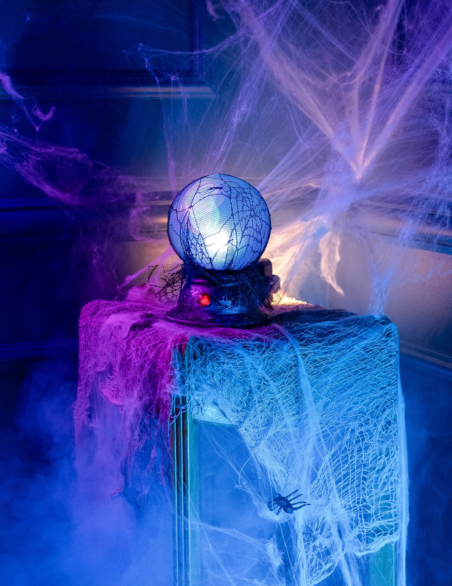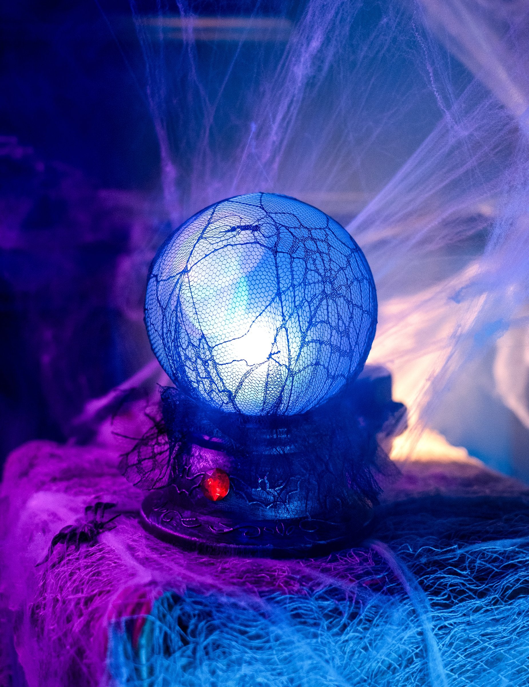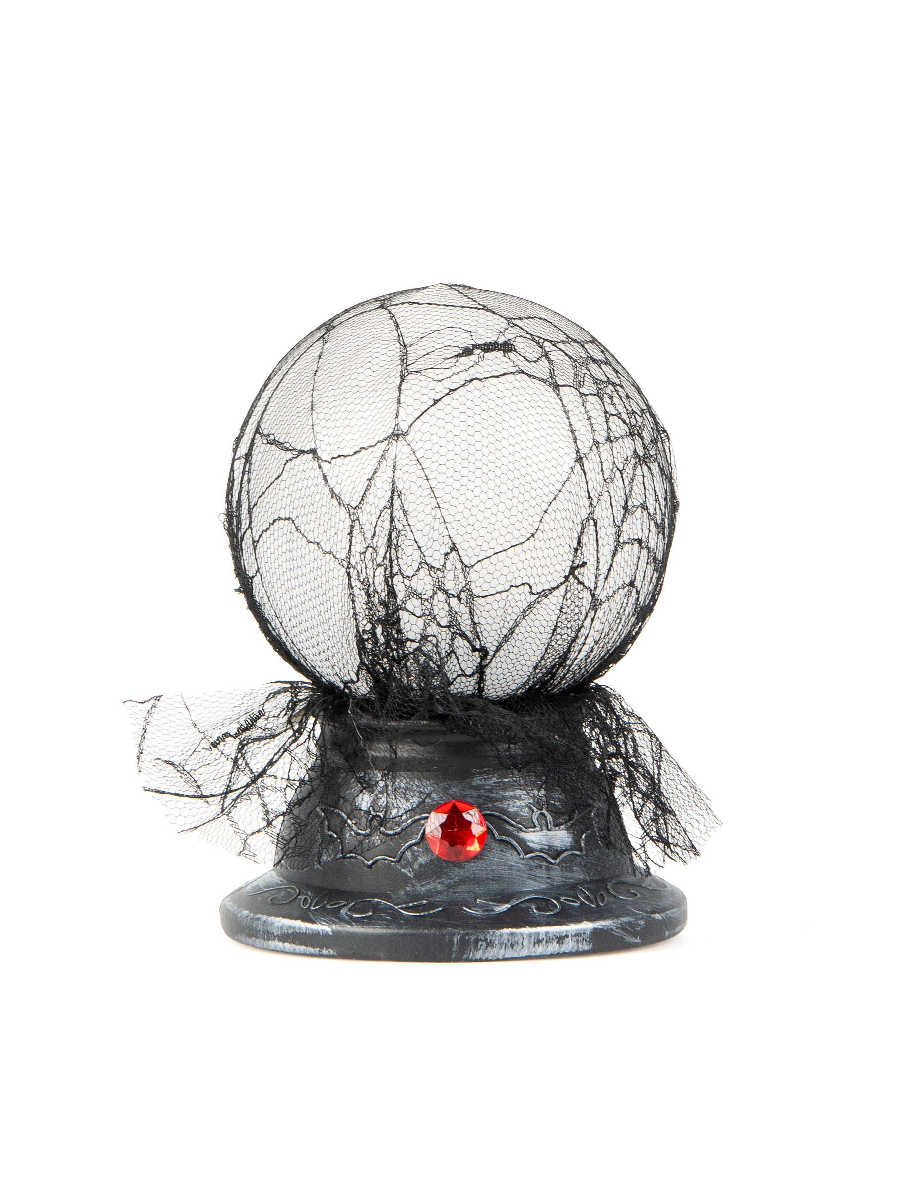 Тази светеща и звукова кристална топка е с размери приблизително 19 х 13 cm. Тази анимирана декорация има база със сребърен метал, украсена с фалшив червен диамант. Освен това е украсена с черен прозрачен воал. Тя ще запали със синьо, а след това бял цвят и ще излъчва плашещи звуци, които ще ви дадат goosebumps ...! Тази кристална топка ще бъде идеална за усъвършенстване на интериорна декорация по време на вашата вечер на Хелоуин!