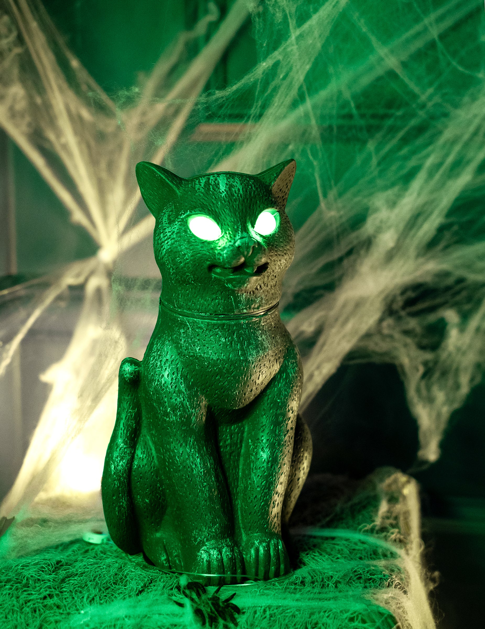 Този звук и ярка черна котка с размери приблизително 30 см. Просто трябва да го включите, така че главата му да се обърне и очите му да светят в зелено. За още по -плашеща страна тази котка бута вой. Тази декорация работи, използвайки 3 батерии AA, които не са включени. Тази черна котка ще бъде идеална за завършване на вашата ужасяваща декорация по случай вашата вечер на Хелоуин!