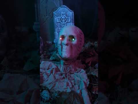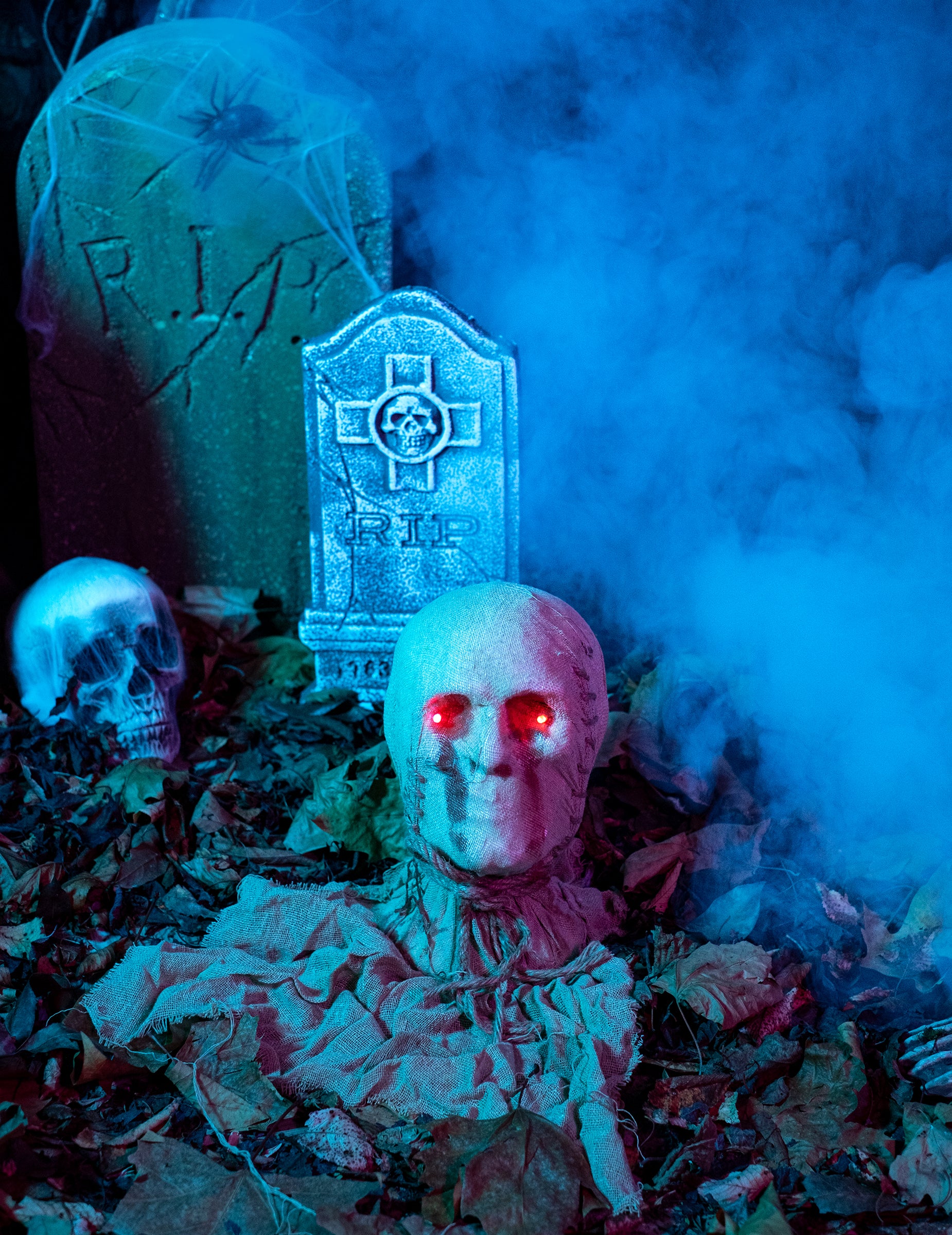 Тази светлинна декорация измерва приблизително 50 cm. Той представлява ужасяваща мумия глава, покрита с клапа от плат. Ще бъде достатъчно да включите бутона за включване/изключване, разположен отзад, за да осветявате очите ви, които мигат в няколко цвята. Работи с помощта на 3 LR44 бутон батерии (включени) Тази лека мумия ще бъде идеална за плашене на вашите гости в Хелоуин вечер!