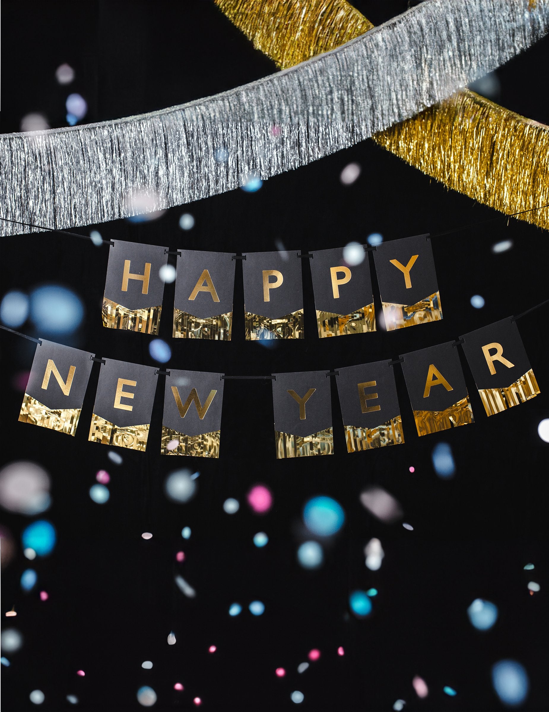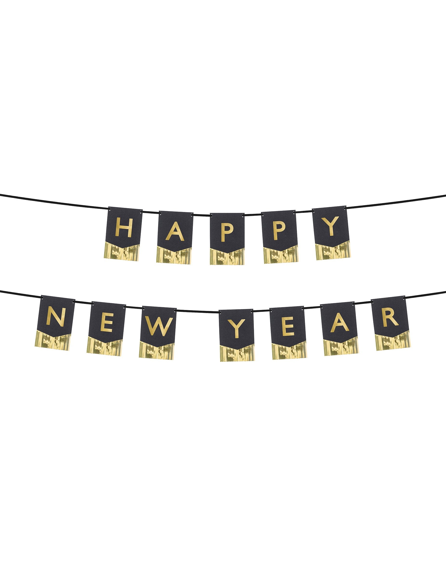 Тази хартия Pennant Garland е дълга около 135 см. Той е съставен от 12 черни панела със златни декорации. На всеки пенал ще намерите писмо със златен цвят, за да образувате надписа „Честита Нова година“. Можете да спрете гирляндата в една линия или да я разделите на 2 части. Тази гирлянда ще бъде идеална за декориране на вашия интериор по случай Нова година!