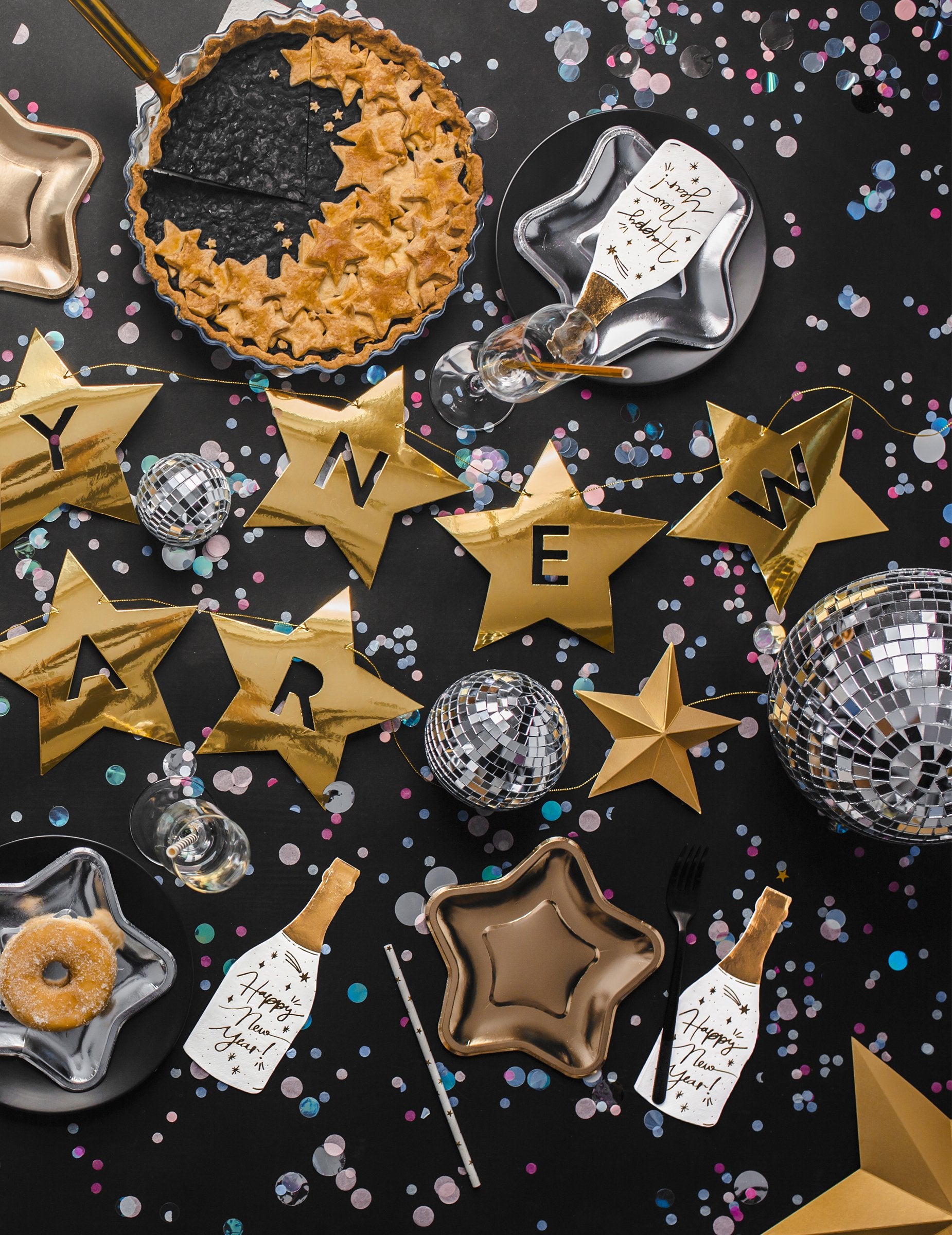 Тази картонена гирлянда е с дължина приблизително 290 см и височина 17 см. Състои се от 12 златни звезди, всяка от които представлява писмо, за да формира „Честита Нова година“. Можете да спрете гирляндата, за да покажете съобщението на един ред или да го нарежете на 2 реда. Тази гирлянда ще бъде идеална за завършване на декорацията на стаята ви през новата година със семейството или приятелите!