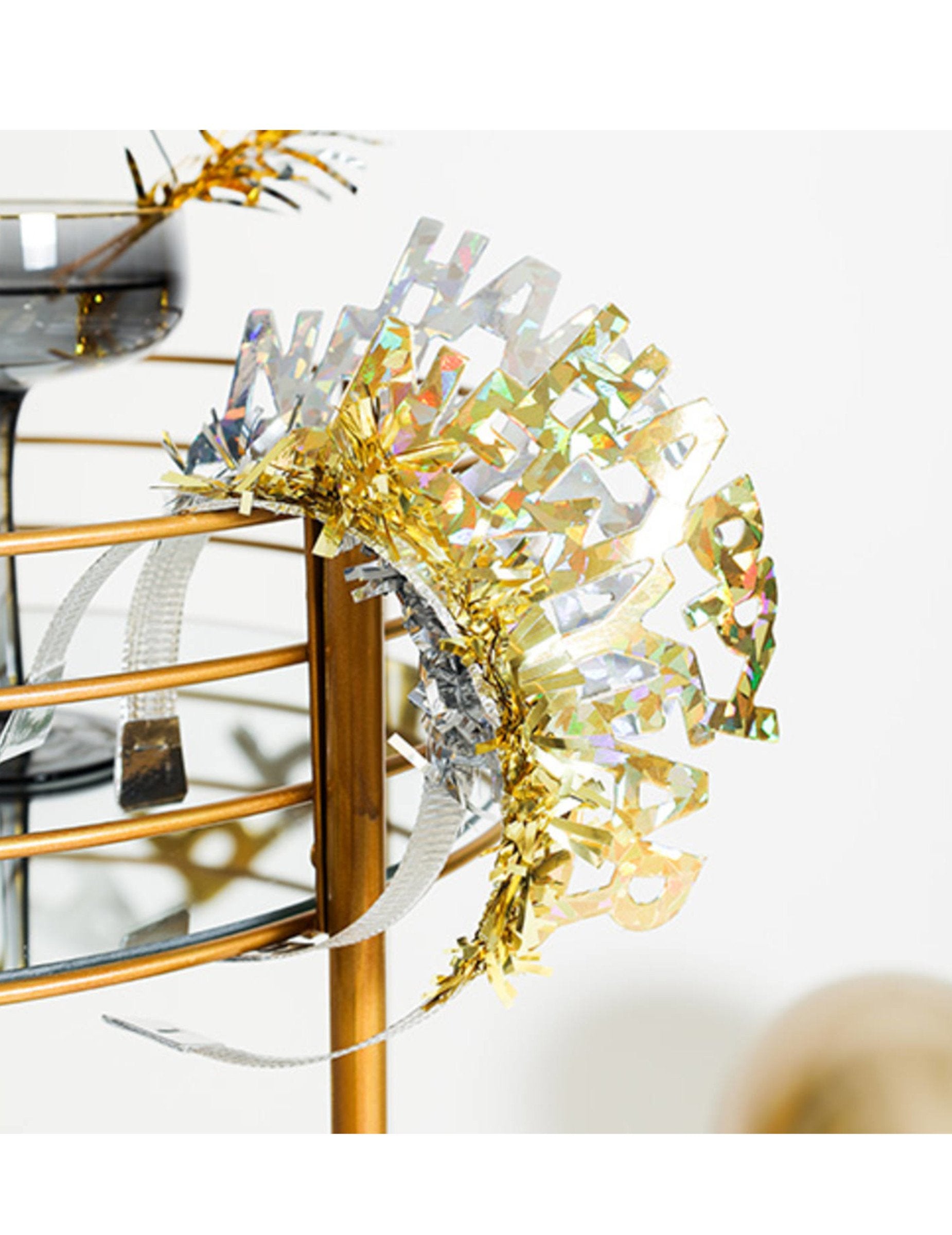 Този комплект със златен и сребърен фактор съдържа 27 парчета. Тя включва: 6 тиара, 6 рога, 6 шапки, 6 маски, 2 серпентини и 1 банер. Той е идеален за празнуване на Нова година с приятели или семейство!