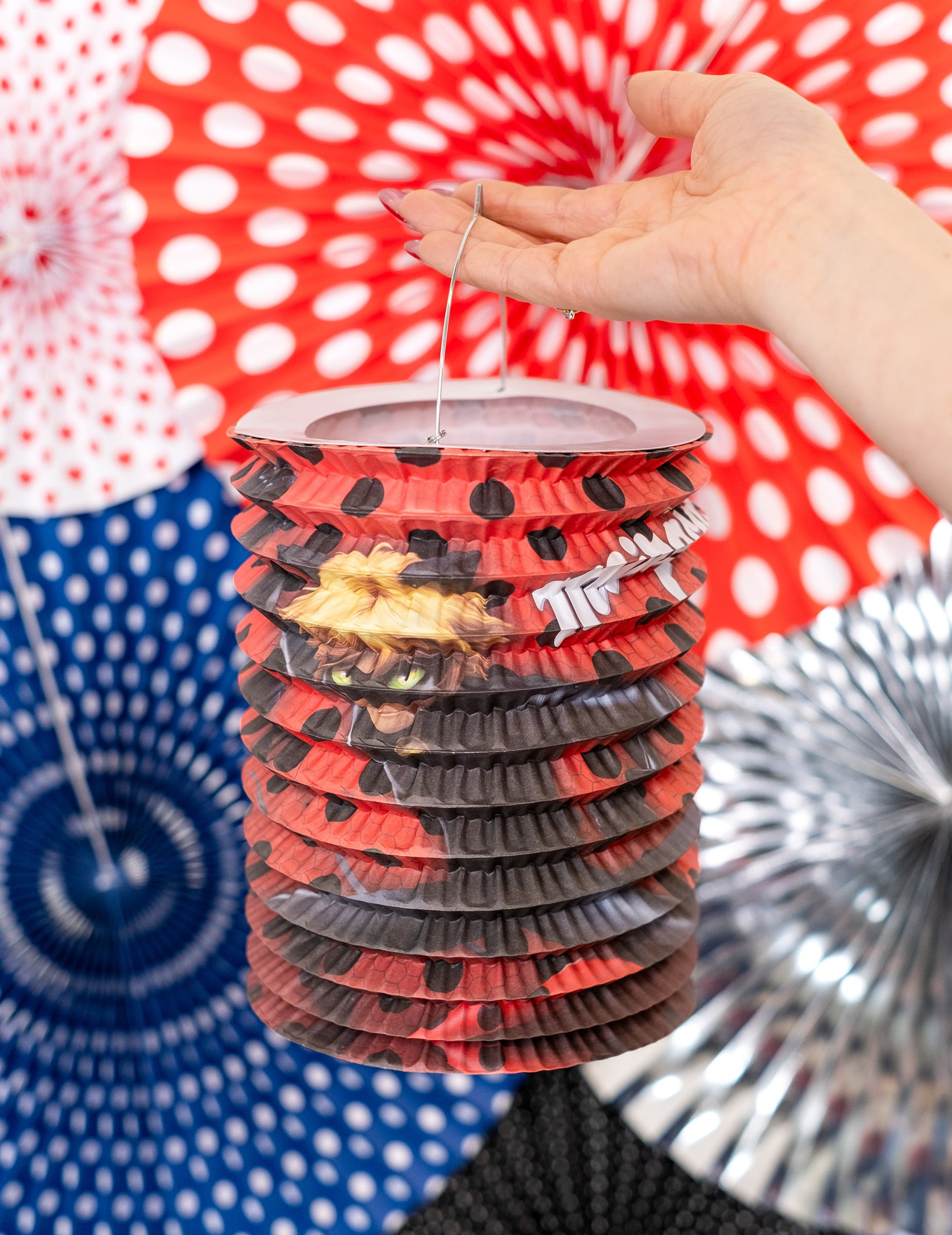 Тази хартия Miraculus Ladybug лампион е под официален лиценз. Това е хартия с образа на калинката в центъра. Той е червен с малки черни кръгове. Висока е 28 см. Вътрешността на Лампион ще намерите стоманена опора, където е възможно да се вмъкне свещ. По този начин можете да окачите декорацията си по практичен и лесен начин. Този Ladybug Lampion е идеален за осветяване на вашите събития по време на рождения ден на детето ви или просто за декорация на стаята му!