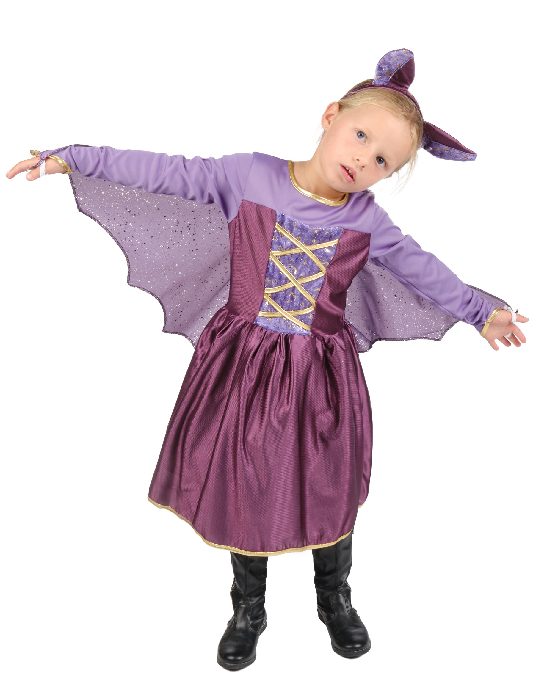 Този костюм на лилаво прилепче е предназначен за момиче. Комплектът включва диадема, рокля с крила и колан.