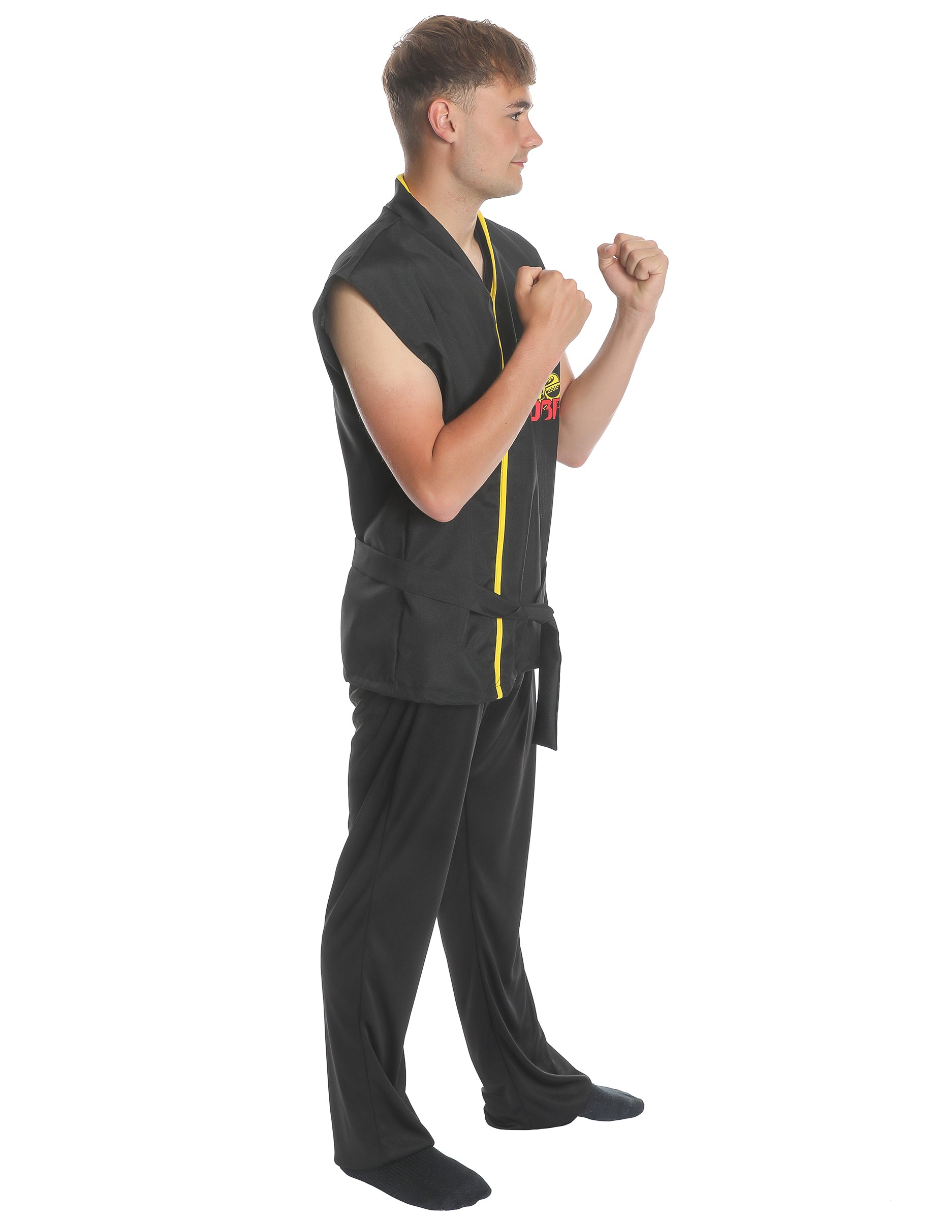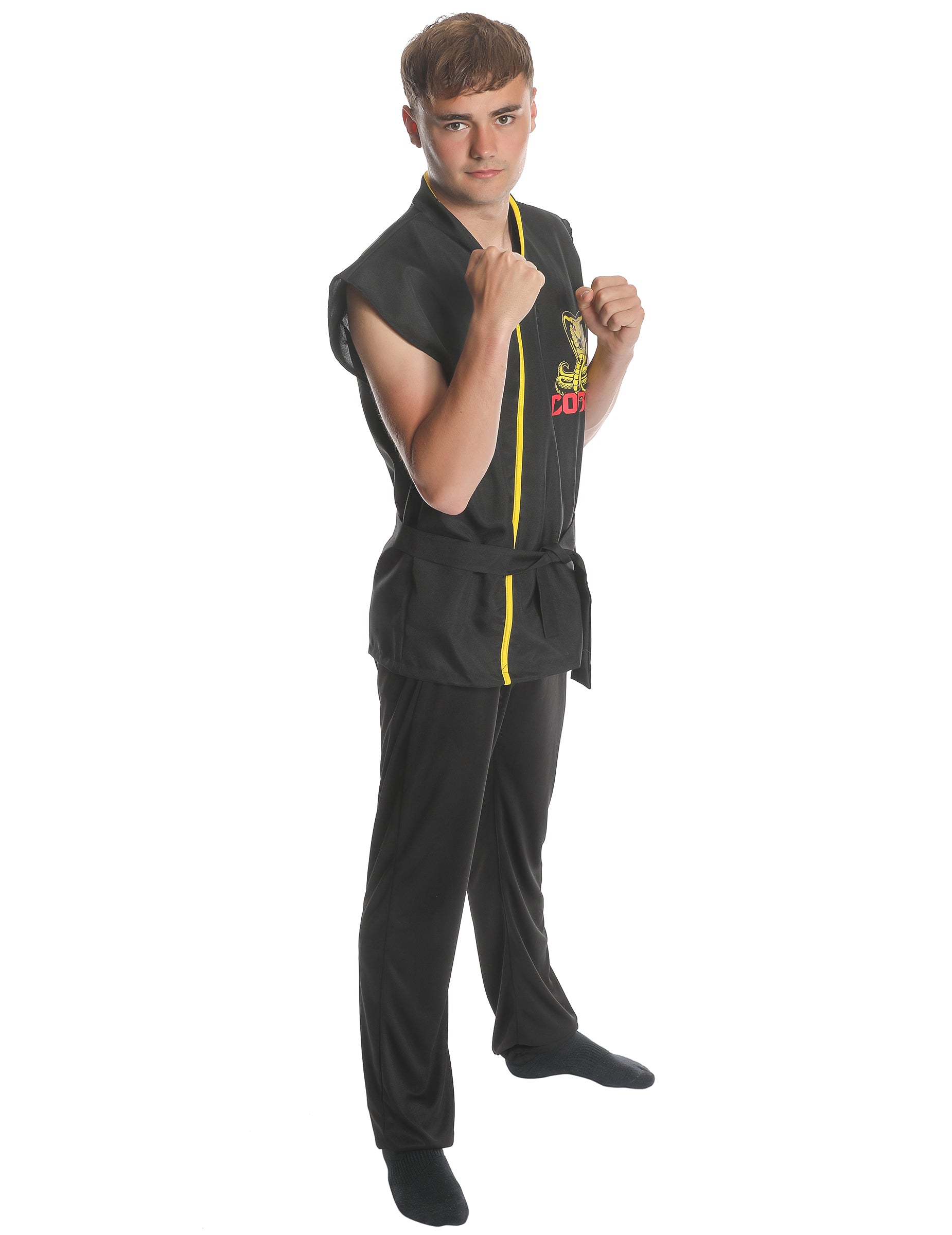 Този костюм на студентите по карате е за възрастни. Тя включва връх, панталони и колан. Горната част е без ръкави, черно и широко високо с жълто лого, представляващо кобра и надпис "кобра" в червено. Панталоните и коланът също са черни. За тематично парти или за карнавал, изберете този костюм на карате студент!