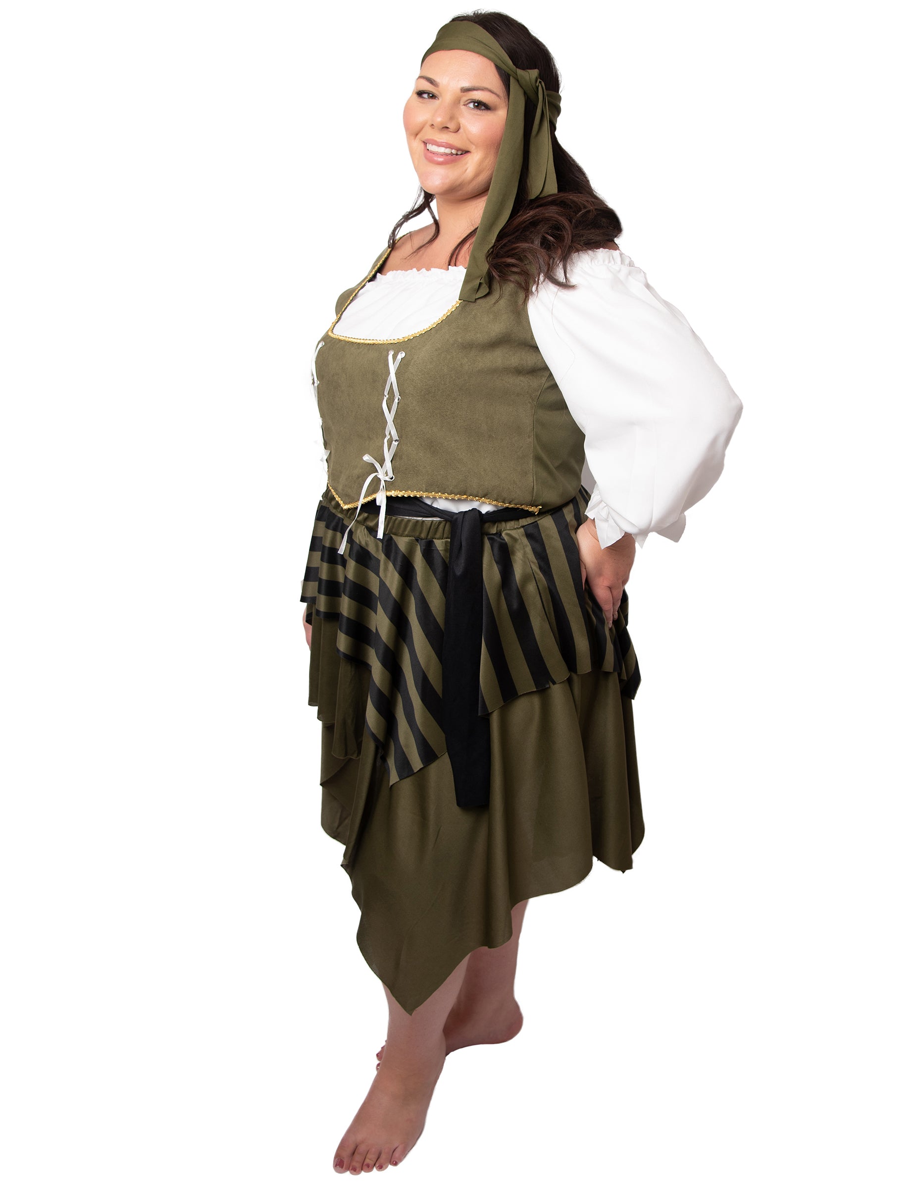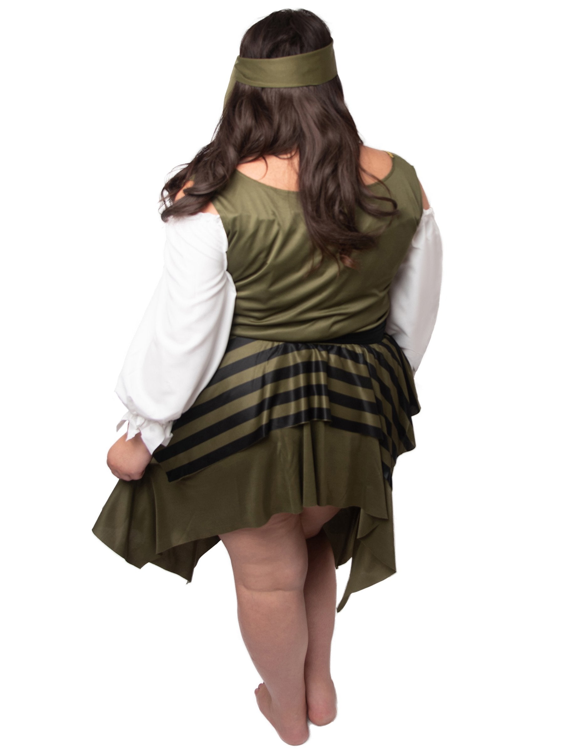 Този голям, голям, голям зелен пиратски костюм е за жените. Тя включва висок, корсет, пола, лента за глава и колан. Блузата на костюма е бяла, характеризираща се с пълния и строг ефект. Корсетът на цвета на Khaki ще бъде добавен над него, съдържащ две бели дантели от всяка страна. Полата също е каки на цвят, с асиметрично разрез, както и черни ленти. Цветната лента на Khaki ще усъвършенства този доста пират. Тази маскировка ще бъде идеална за усъвършенстване на вашия карнавален ден или за Нова година!