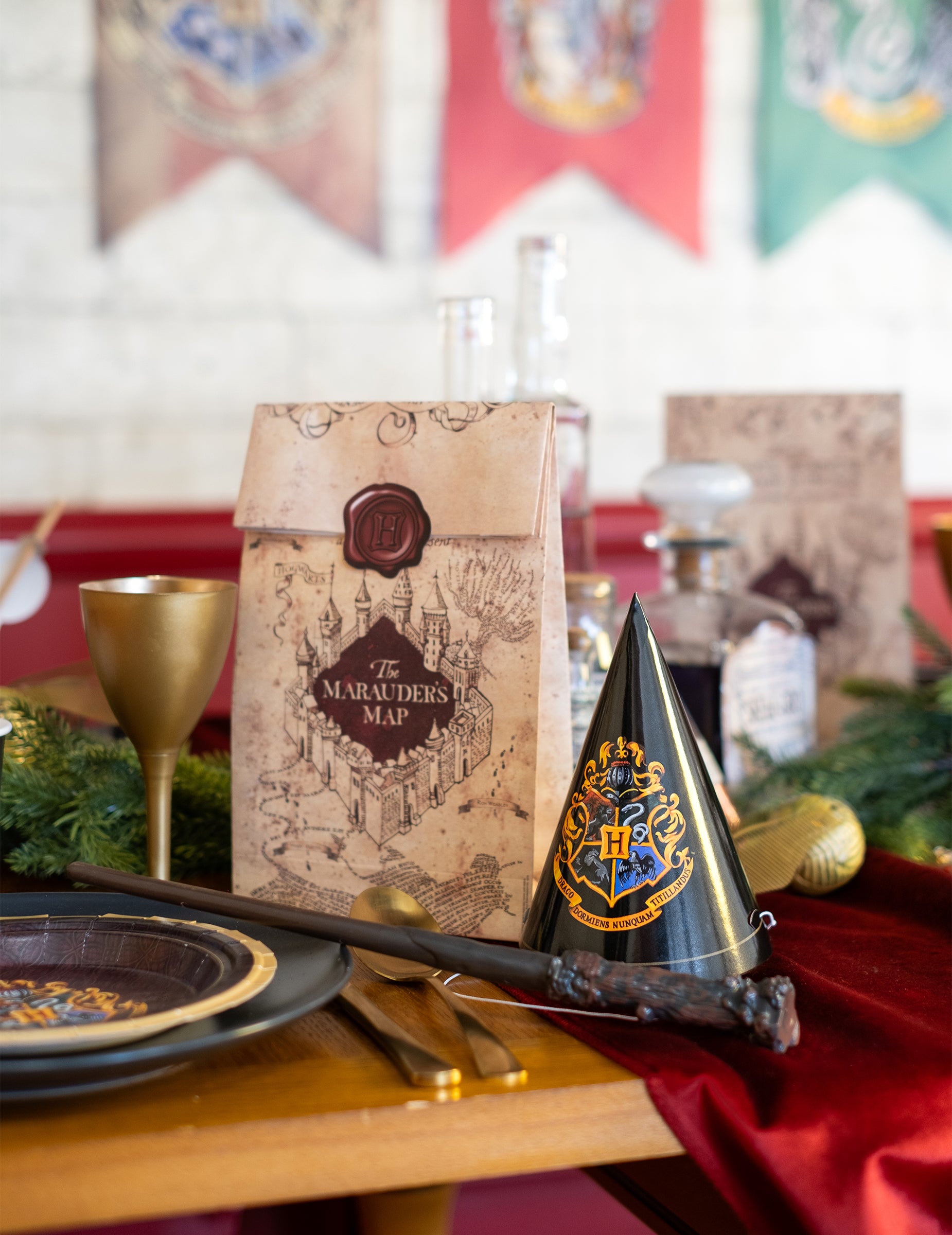 Те са направени от хартия и са с размери приблизително 12 cm 16 в диаметър и 16 в дължина. Те са черни и украсени с герба на Хогуортс, който включва 4-те дома от сагата: Грифиндор, Рейвънклоу, Хафълпаф и Слидерин.