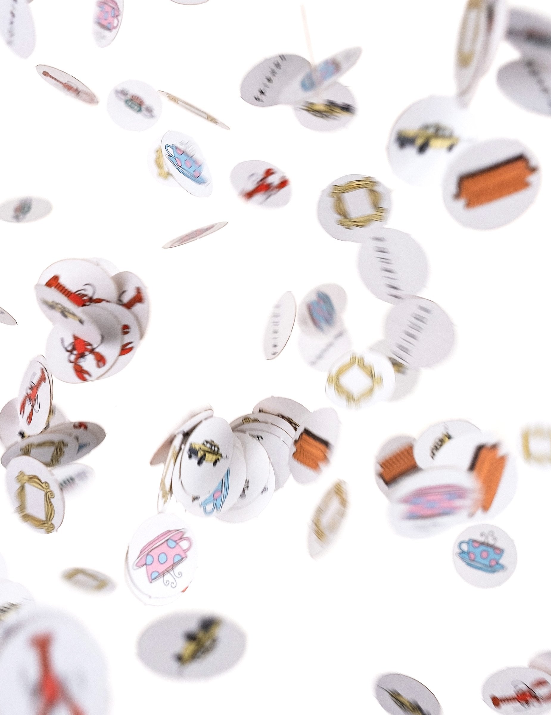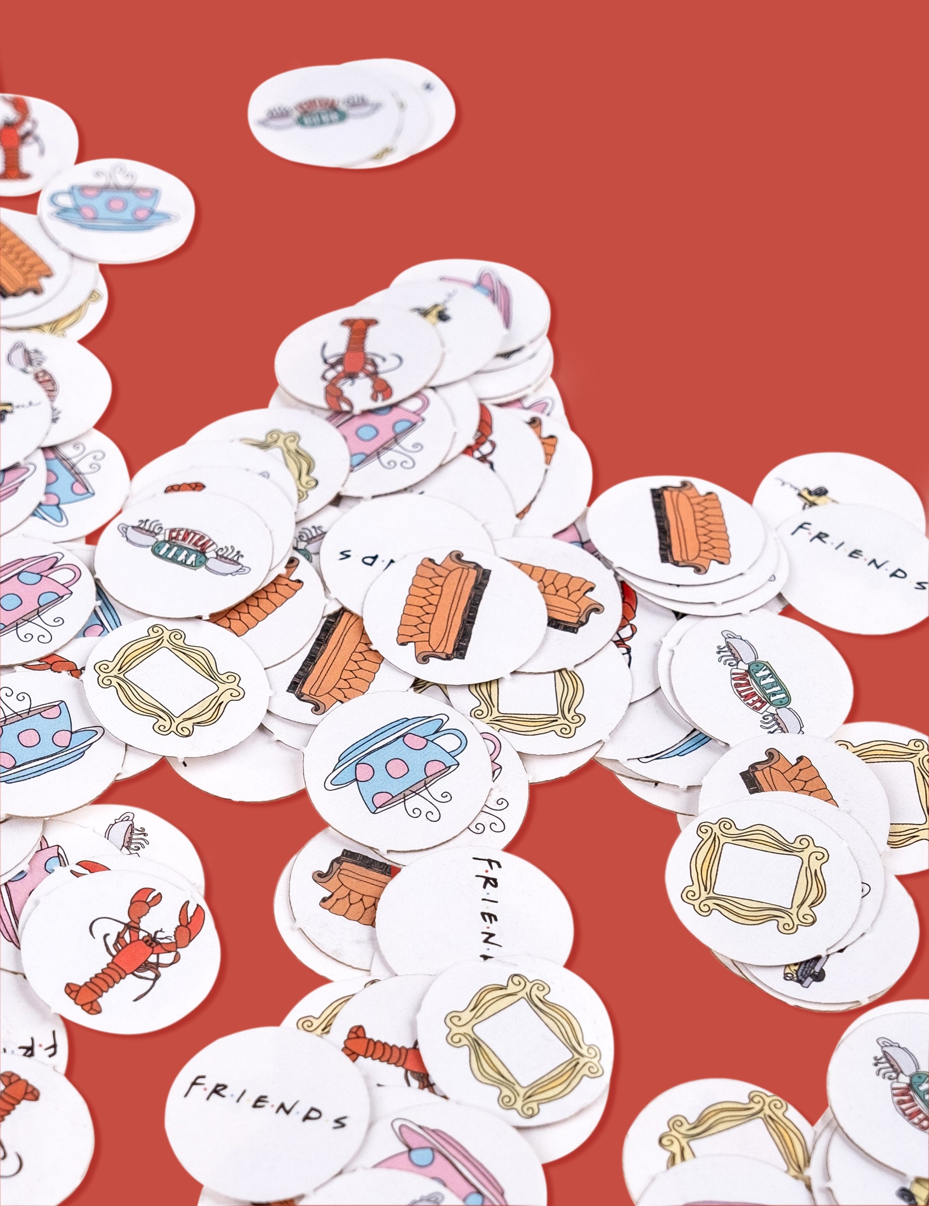 Под официален лиценз за приятели, този лот включва 160 картонени конфети. Конфетите представляват различни модели във връзка със серията Friends и са с диаметър 2 см. Те ще бъдат идеални за завършване на вашата декорация по темата за приятели!