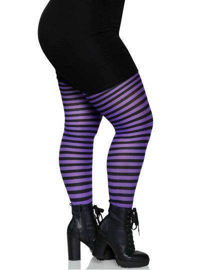 Тези раирани чорапогащи са за жени. Те са черни и лилави. Тези чорапогащи ще бъдат идеални за завършване на костюм на вещици и вампири или за готически вид по време на Хелоуин вечер.