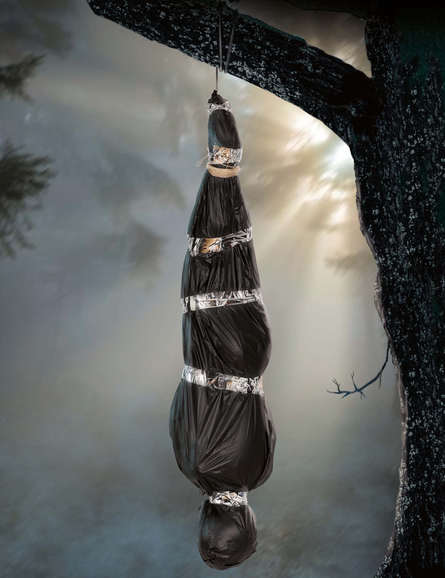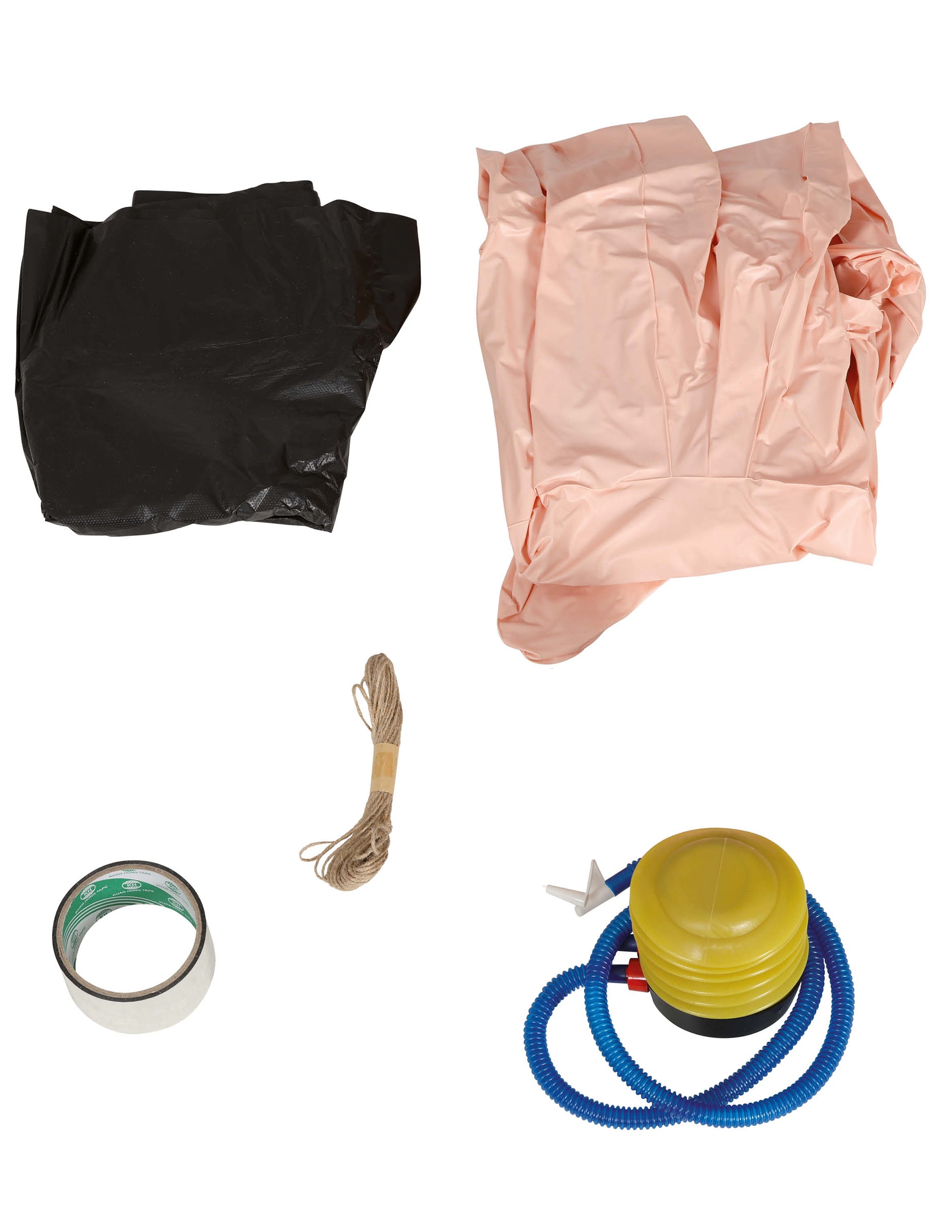Този комплект представлява фалшив труп в надуваема чанта с дължина 178 см. Той е съставен от надуваем труп, пластмасова торбичка, лепилна лента, струна и помпа. Пластмасовата торбичка е черна, докато лепилната лента е алуминирана, а струната е бежова. Трупът, който ще бъде вързан вътре, е плът на цвят. Метод на употреба: - Индуцирайте фалшивия труп с помпата. - Поставете тялото в пластмасовата торбичка и го увийте с помощта на лепилната лента. - Увийте тялото на трупа, като използвате низа, така че да можете да го закачите. - Изберете идеалното място да го поставите във вашия дом или градина. Този елемент на декорация ще накара най -ужасяващите чудовища да избягат и да превърнат дома ви в истинска къща с обитатели за Хелоуин!