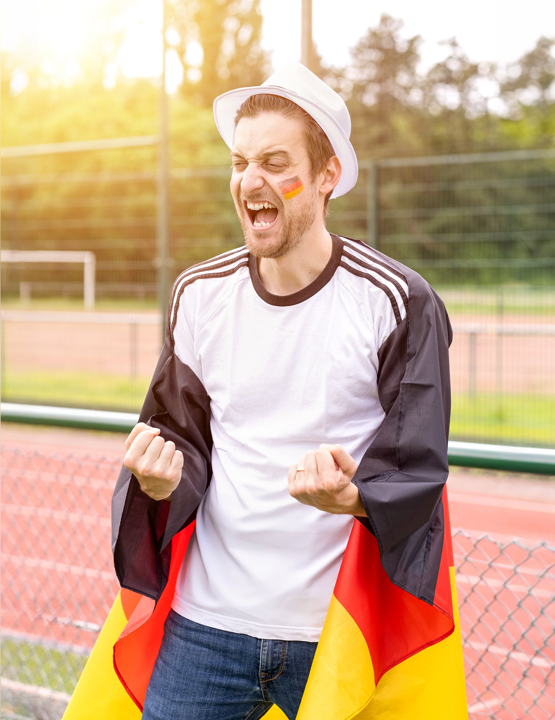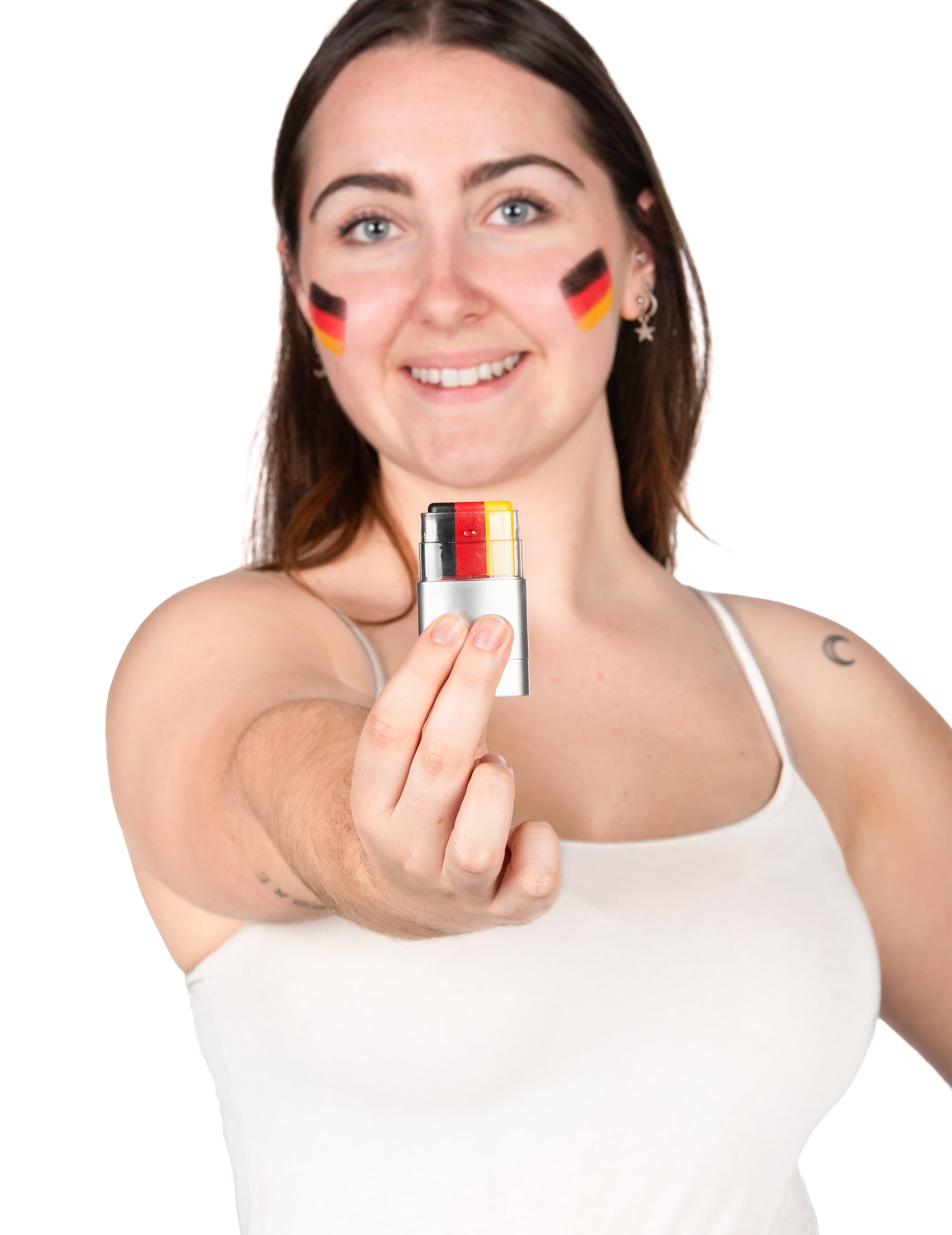 Този комплект за грим за поддръжници е за възрастни. Той е в цветовете на знамето на Германия: черно, червено и жълто. Тази пръчка ще ви позволи да нанасяте грим бързо и равномерно. Този грим от Германия е от съществено значение за привърженик на германския отбор по време на спортни състезания като Олимпийските игри или Световната купа!
