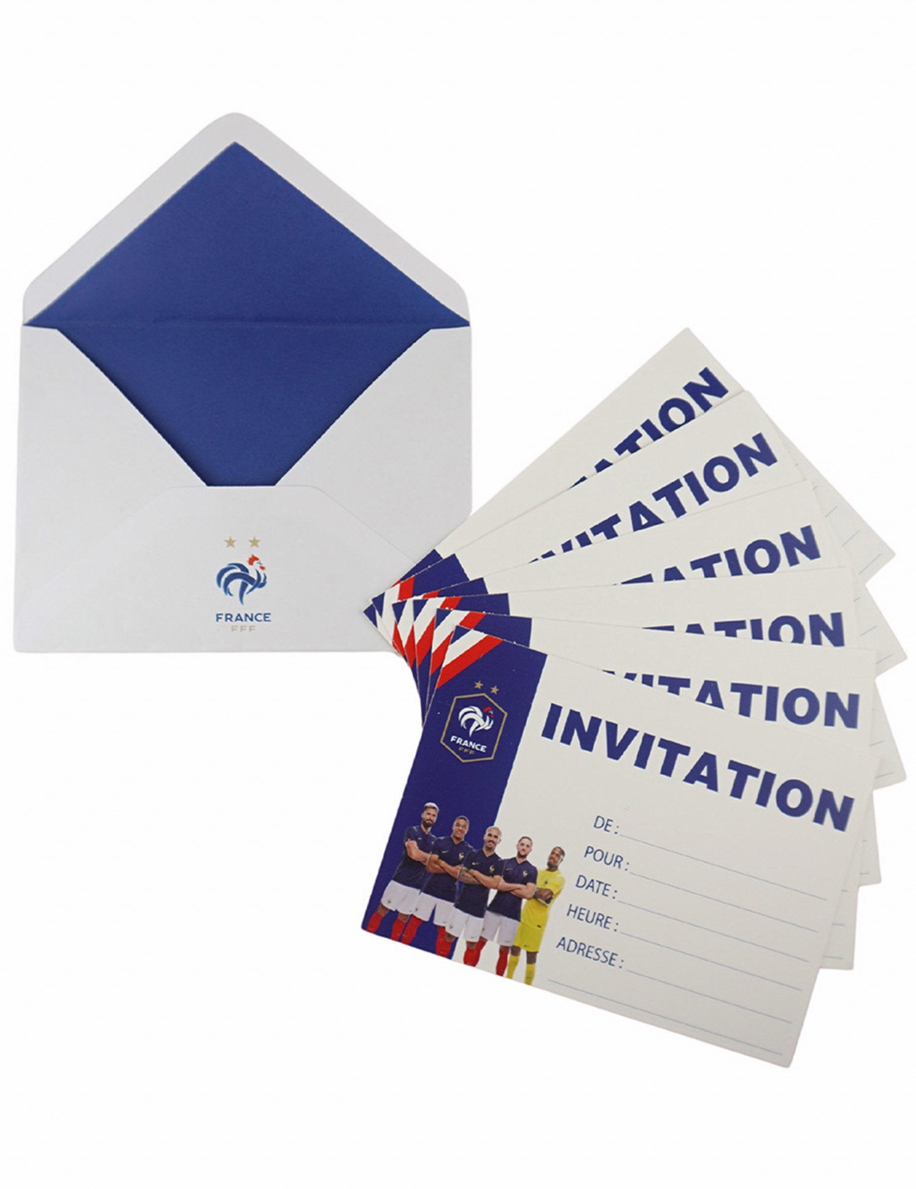 Тези покани се продават с набор от 6 с техните пликове. Под официален лиценз на FFF поканите са бели и са украсени с определени играчи от френския отбор. Те също носят логото на FFF с петел и 2 звезди. Пликовете са бели отвън и сини отвътре. Те са украсени с логото на Френската футболна федерация. Поканете приятелите си на закуска за рожден ден на темата за футбола с тази партида за покана за FFF!