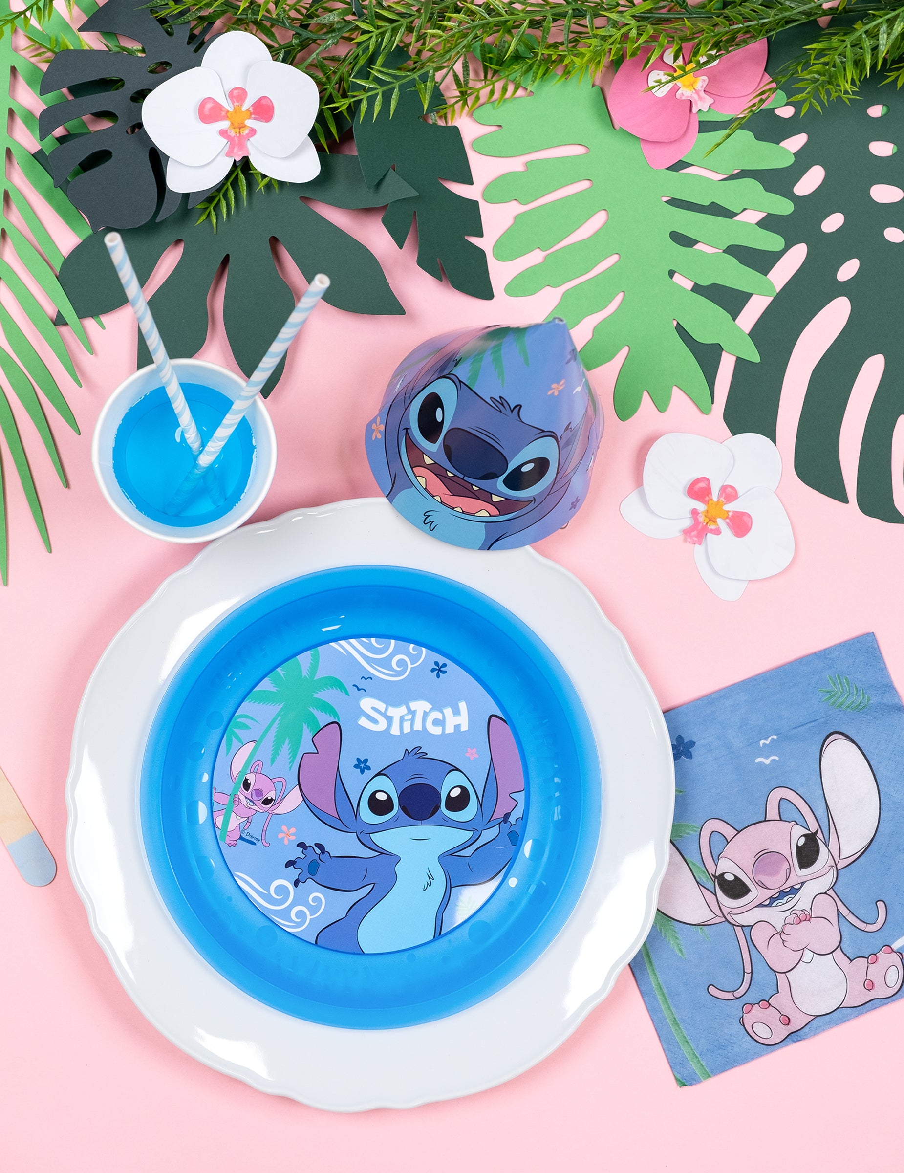 Тези табели за многократна употреба се продават в много 4. Те са пластмасови и измерват около 21 см в диаметър. Под официален шев на лиценза, те са сини и представляват любимия герой на Дисни на децата, шев с приятеля му Ангел. Предложете незабравима памет на вашите гости с тези чинии за многократна употреба по случай закуска за рожден ден на вашето дете!