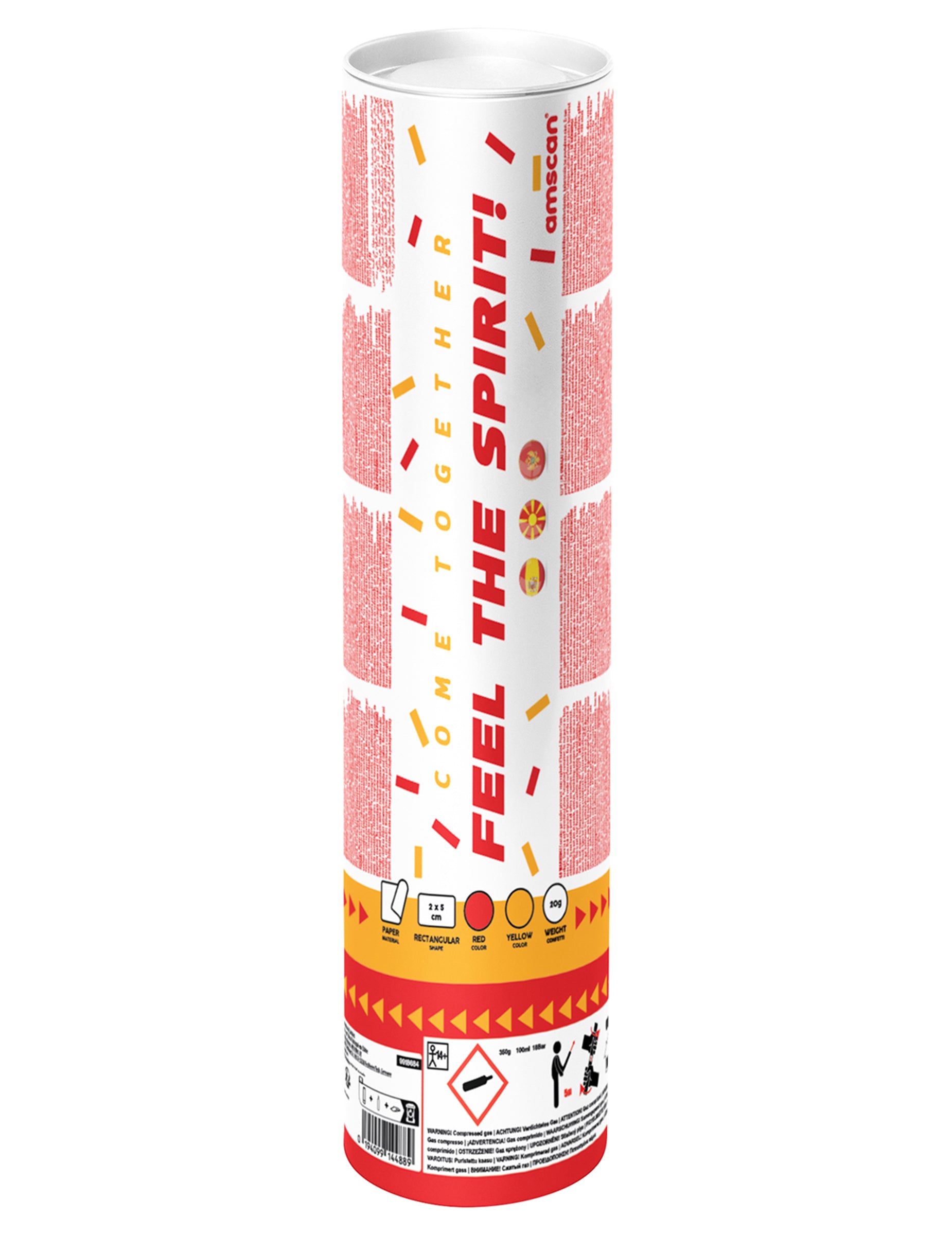 Това оръдие на конфети ще бъде идеално в подкрепа на националния отбор на Испания по време на спортни събития! Той е лесен за използване, завъртете дъното на цевта, следвайки посоката на стрелките, за да я активирате. Конфетите в този какън са червена и жълта хартия.