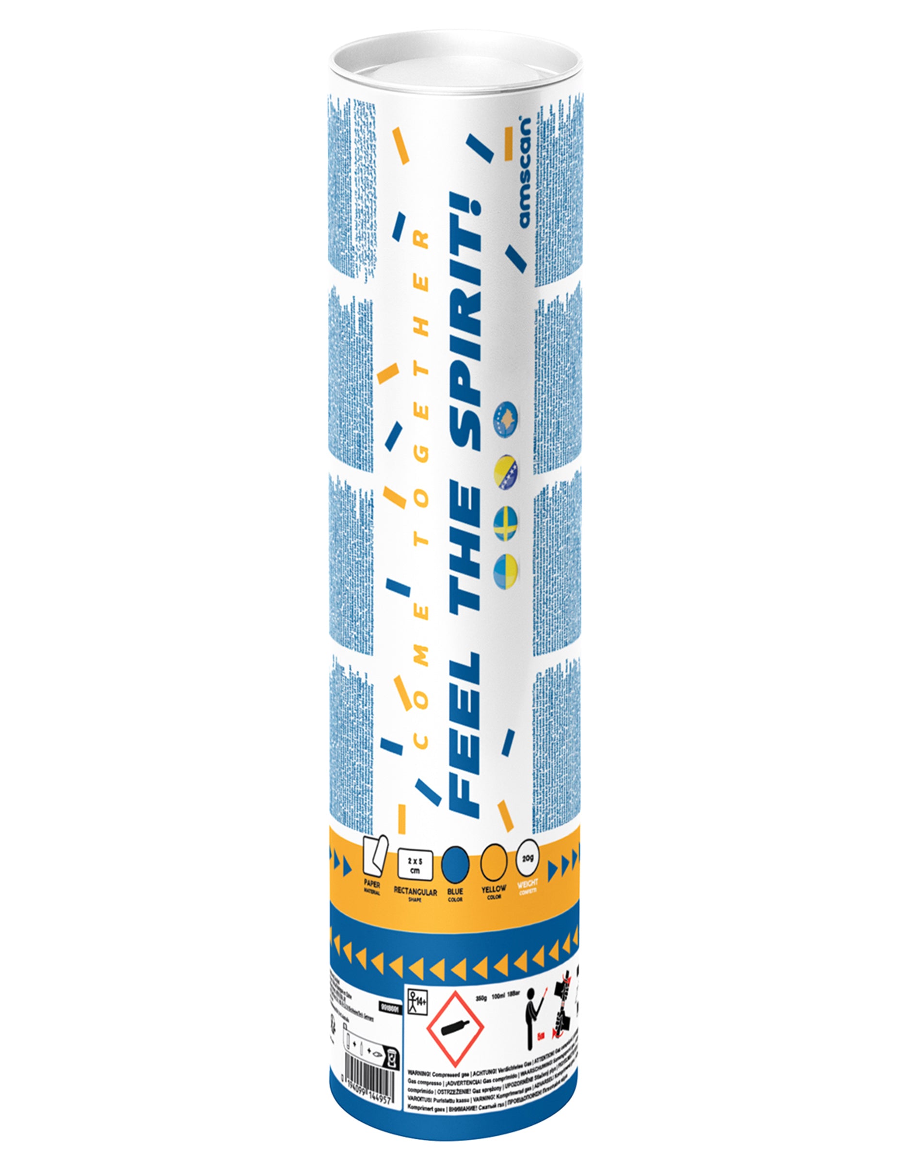 Това оръдие на конфети е идеално за подкрепа на националния отбор на Швеция по време на спортно събитие! Състои се от жълти и сини правоъгълни конфети. Неговият режим на работа е прост, просто трябва да завъртите долната част на цевта за експлозия на конфети!