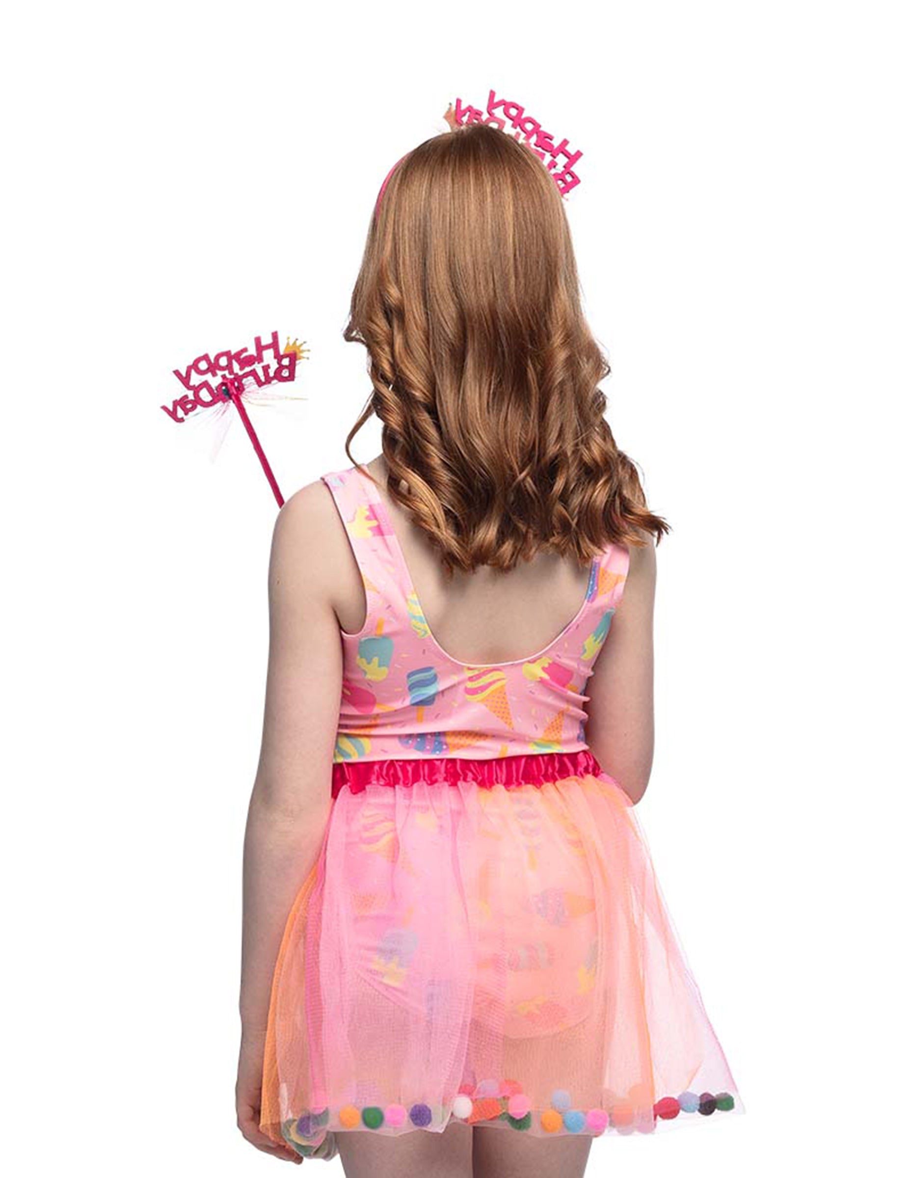 Този фея на честития рожден ден включва тиара, туту и ​​багет. Тиарата и багетът имат ярки цветове и носят надписа „Честит рожден ден“. Тиарата е лента за глава, а багетът е украсен с тюл. Тутуто се състои от прозрачен розов тюл и е декориран с великолепен пастелен розов възел при размера. Този фея на честития рожден ден ще бъде идеален за празнуване на рождения ден на дъщеря ви!