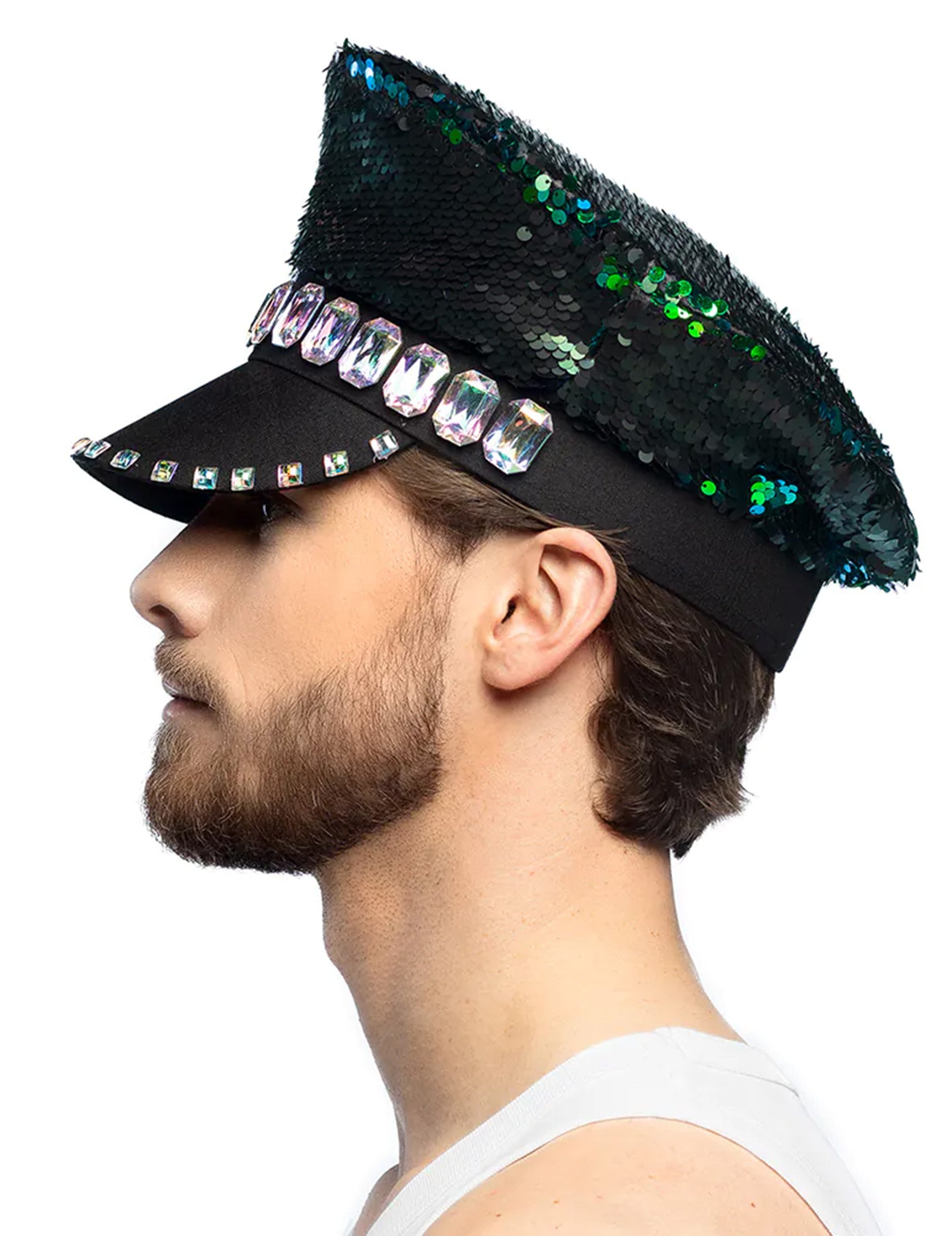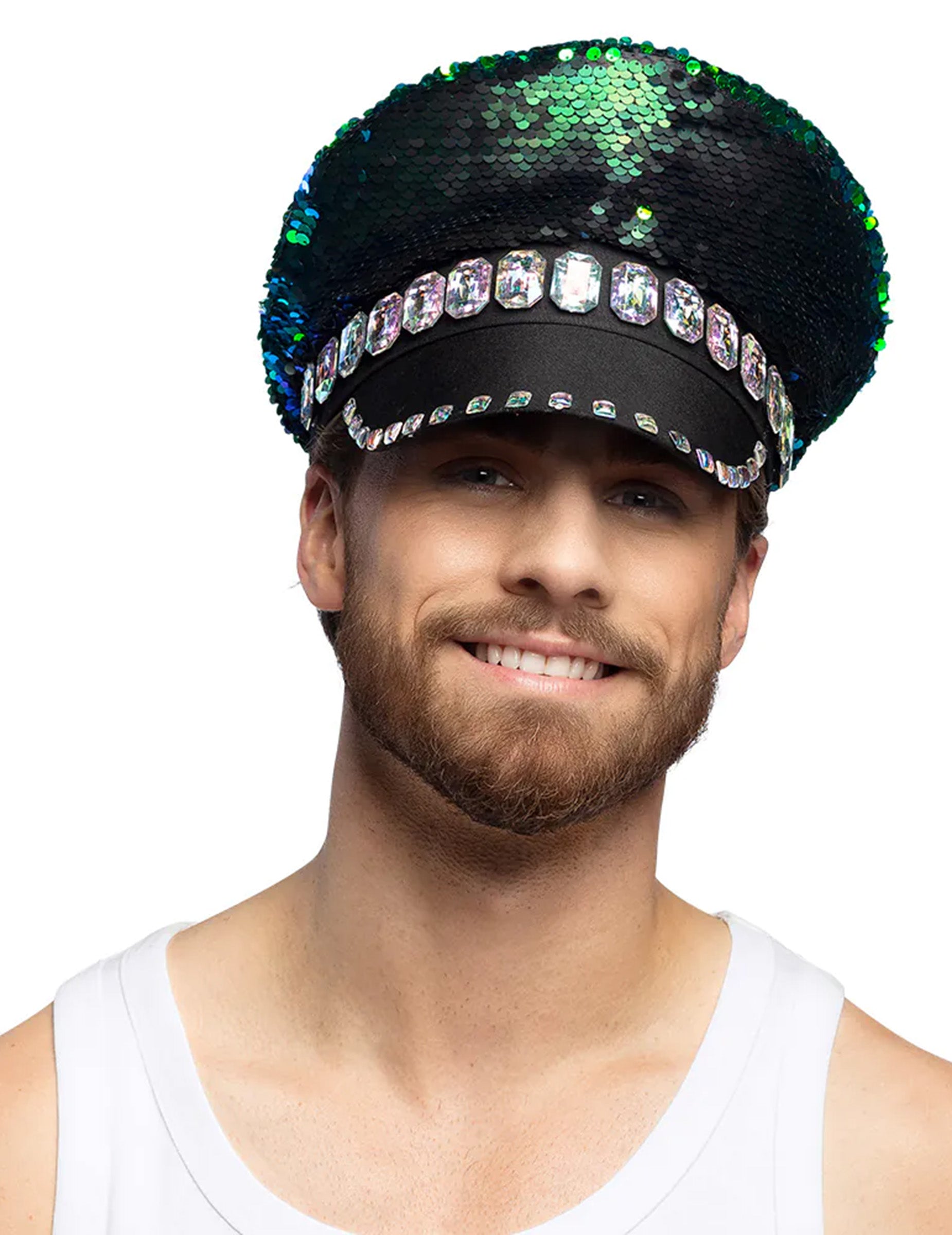 Тази синя и синя обратима капачка за пайети е за възрастни. Той има обратими пайети, които променят черен цвят с искрящо синкаво зелено, като по този начин привлича вниманието на всички около вас! Няма да останете незабелязани с тази шапка на тенденцията, идеална за диско вечер или за следващия си фестивал!