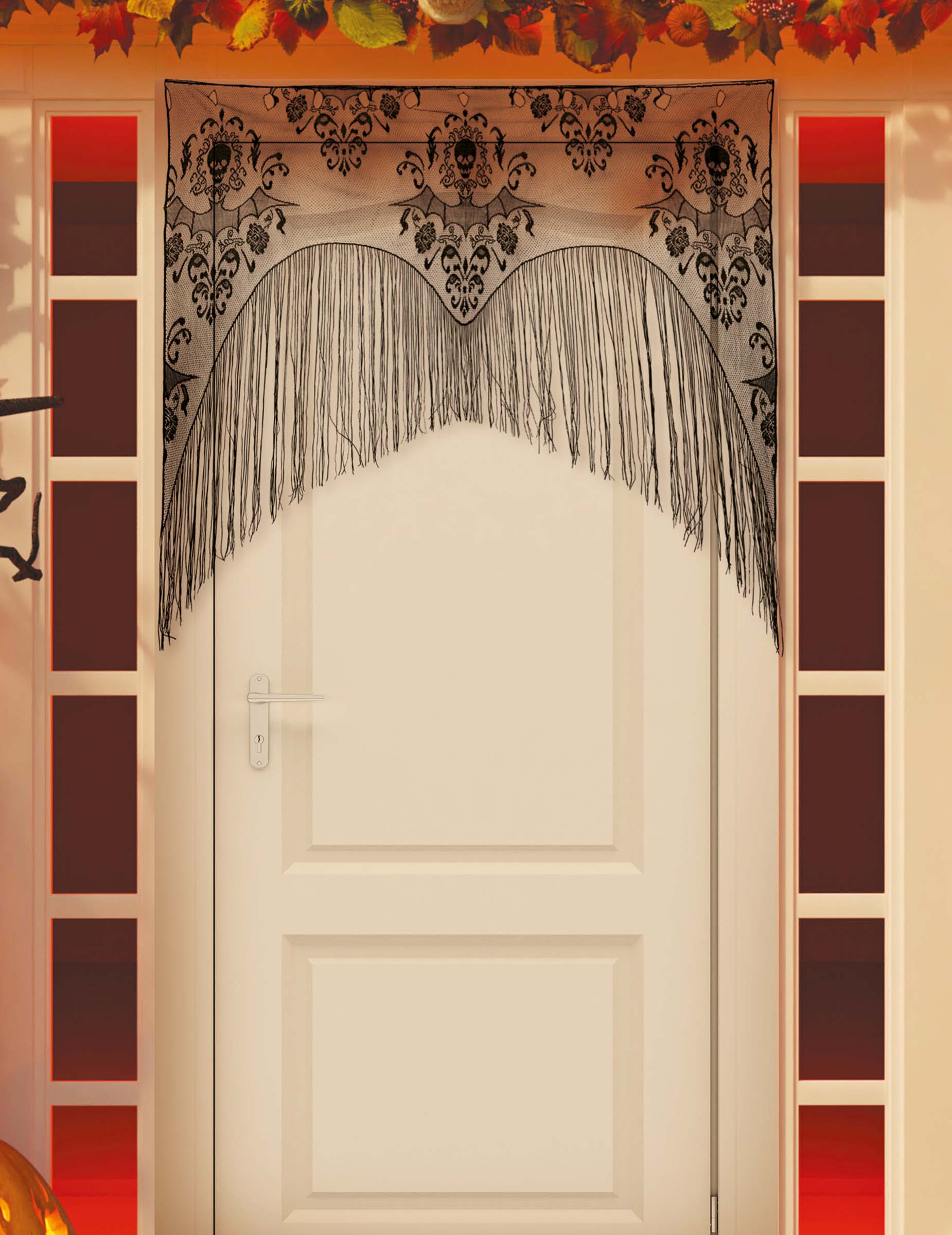 Тази рефренска завеса на вратата е с размери приблизително 95 х 100 cm. Черен цвят, завесата е украсена с черепи и прилепи. Черните граници придават на завесата зловещ външен вид, който ще добави нотка на ужасяващ клас към вратата на вашата къща. Това ще бъде перфектна декорация на Хелоуин за тематично парти за Хелоуин!