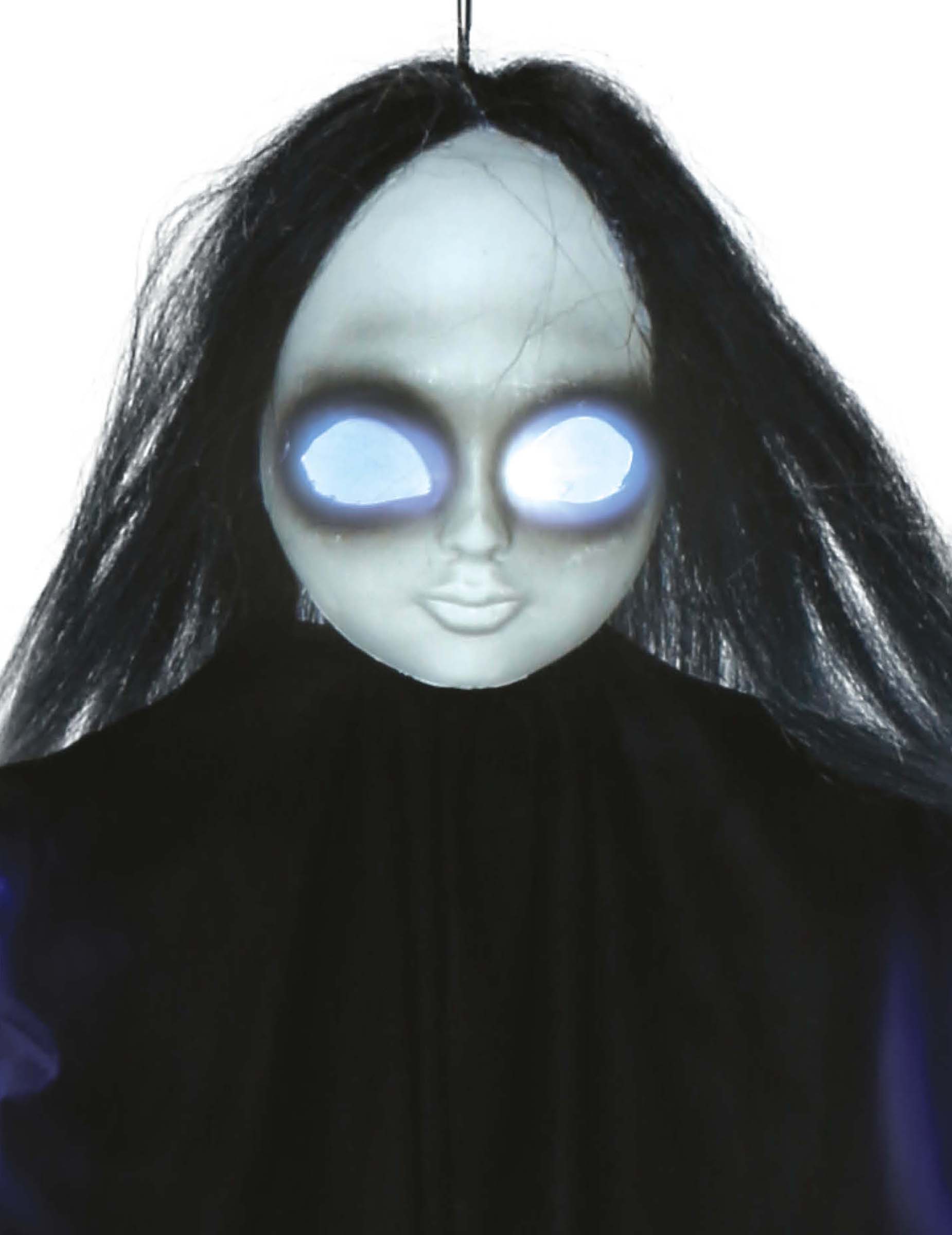 Тази плашеща висяща кукла е с размери приблизително 130 см и е оборудвана със светлинни и звукови функции, с 3 батерии, предвидени за незабавна употреба. Създадена с реалистични и зловещи детайли, куклата има очи, които блестят в синьо в тъмното. Звуковите ефекти добавят нотка на допълнителен терор към тази украса. Перфектен за празненства на Хелоуин, вечери на темата на ужасите или атракции с обитавани от духове, тази плашеща кукла е идеална за създаване на смущаваща атмосфера. Закачете го на вход, на тераса или в тъмна стая, за да изненадате и изплашите гостите си.