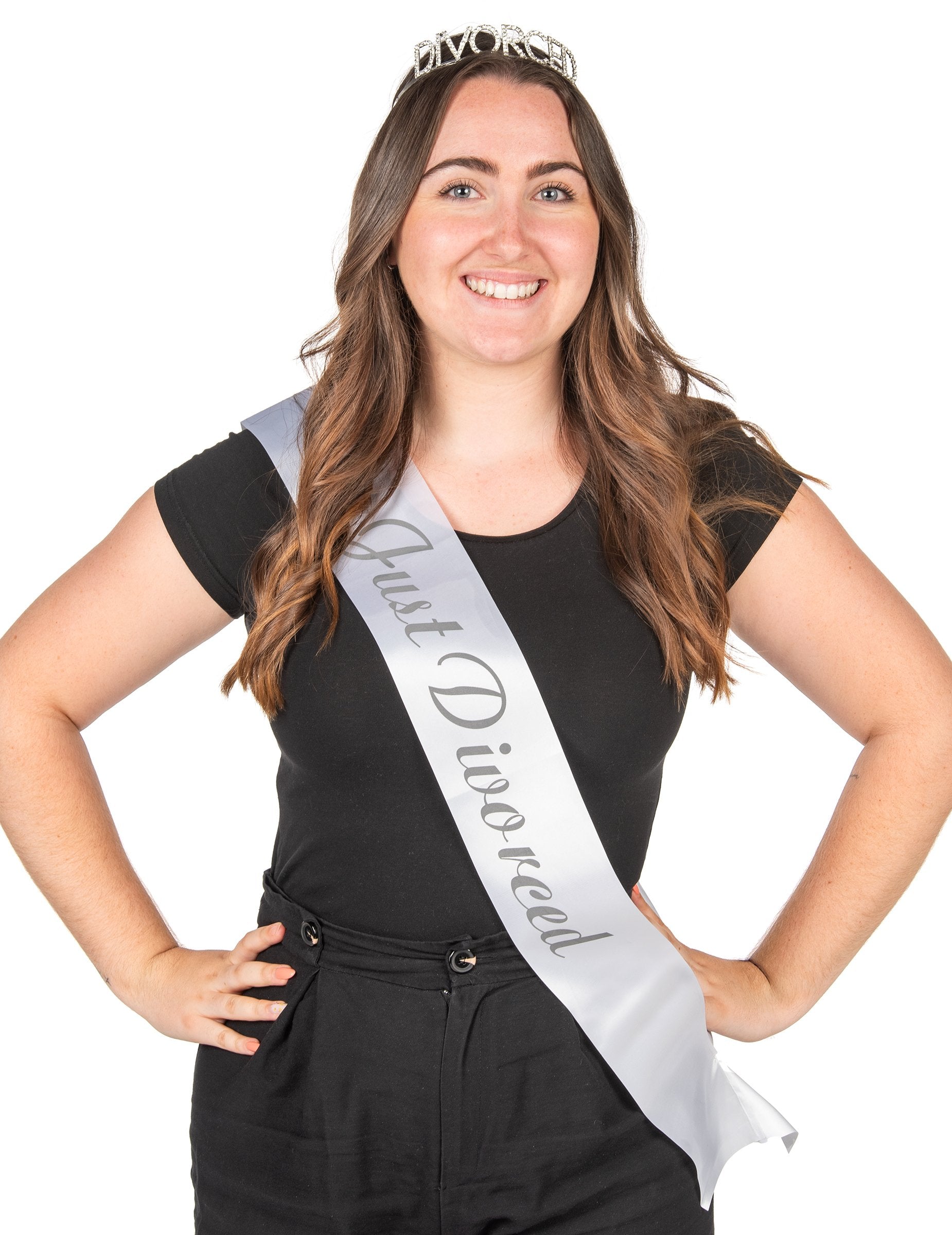 Този комплект съдържа корона и шал. . Металната корона, украсена с искрящи кристали, добавя нотка на елегантност и забавление на вашето облекло. Той е проектиран да се утаи удобно благодарение на интегрираните си гребени, което ви позволява да блестите цяла вечер, без да се движите. Писмата „разведени“ в Rhinestones улавят светлината и привличат всички очи, което ви прави звездата на партито. Шалът „току -що разведе“ перфектно завършва този комплект. Отпечатани с елегантни букви върху сатенена материя, той е едновременно шик и бляскав. Лесен за носене, той се настройва около рамото ви за пропуснат външен вид. С нашата "току -що разведена" корона и шал, превърнете жизнения етап в празнична възможност!