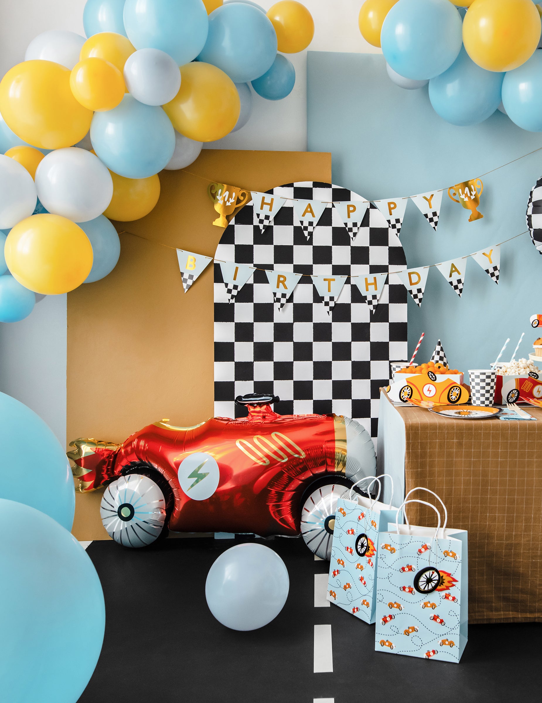 Тази алуминиева топка във формата на червен състезателен автомобил е с размери приблизително 92 х 45 см веднъж надута и 11 см х 63 см плосък. Перфектен за рождени дни или тематични събития, тази топка може да бъде подута с въздух или хелий за ефектен ефект. Добавете нотка на скорост и вълнение към вашата декорация с тази ярка и динамична състезателна топка!
