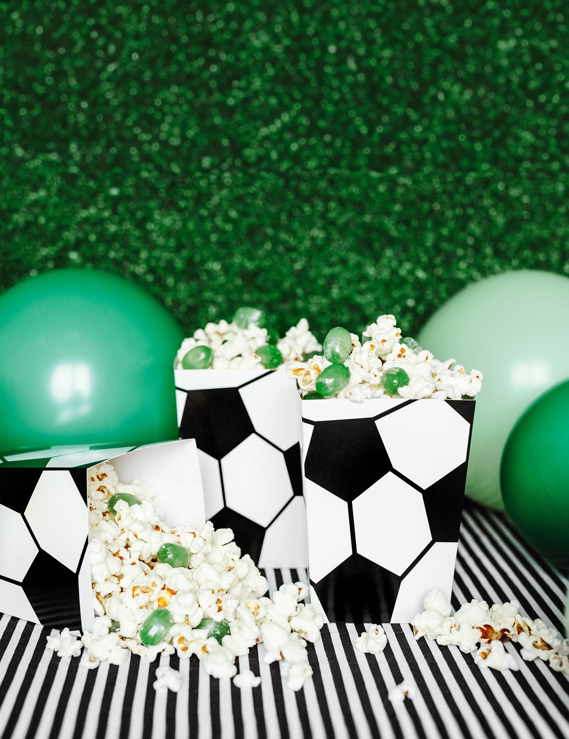 Този комплект съдържа 6 кутии за пуканки по темата на футболВсяка кутия е с размери приблизително 7 x 7 x 12,5 cm и е украсена с черно-бял футболен мотив.