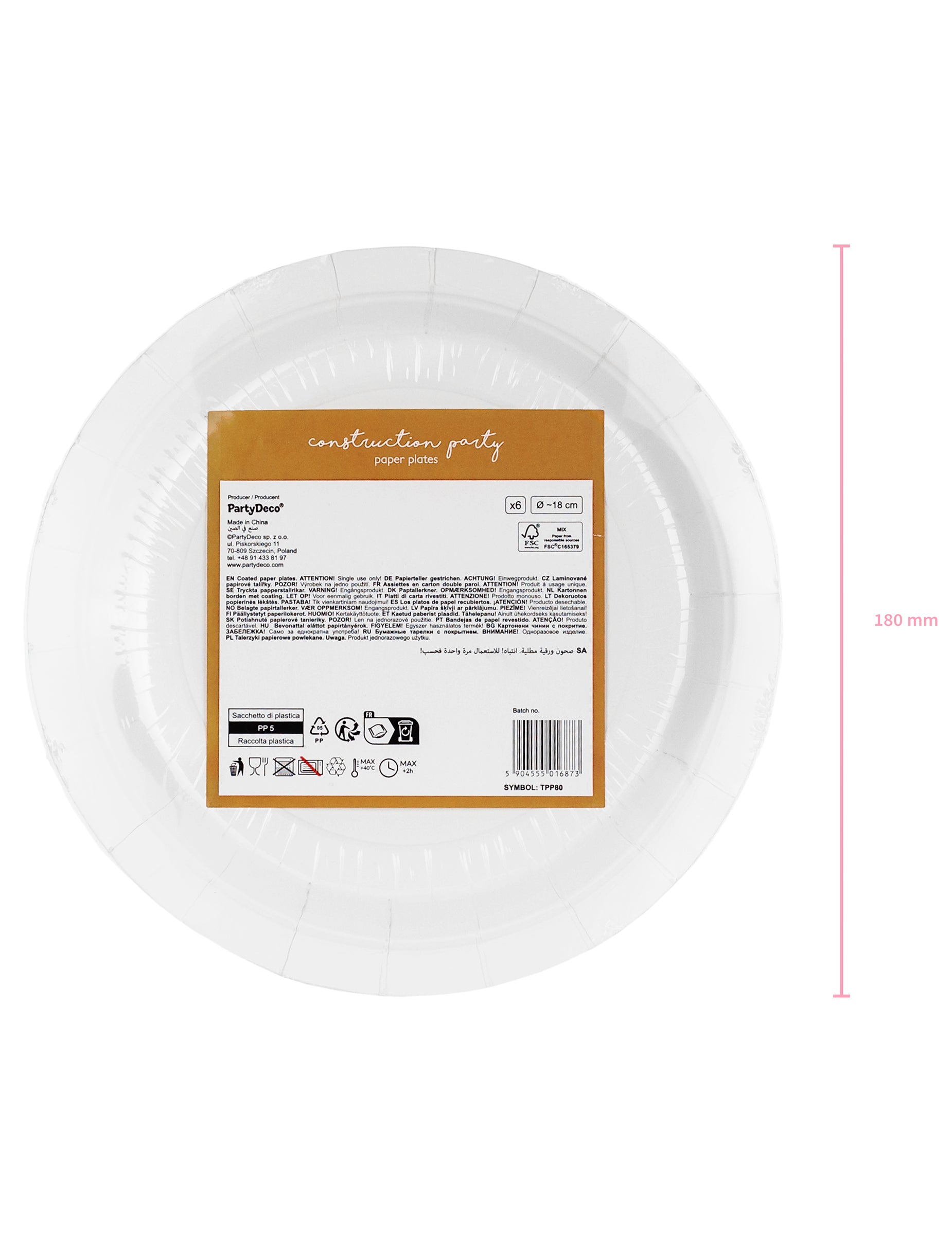 Тази партида се състои от 6 плочи на площадката и е с диаметър приблизително 18 см. Всяка чиния е с кремав цвят с ментов цвят на мента и няколко елемента, представени припомнящи сайт: булдозери, камиони и оранжеви конуси. Тези табели ще бъдат идеални за завършване на декорацията на рожден ден по темата за работата!