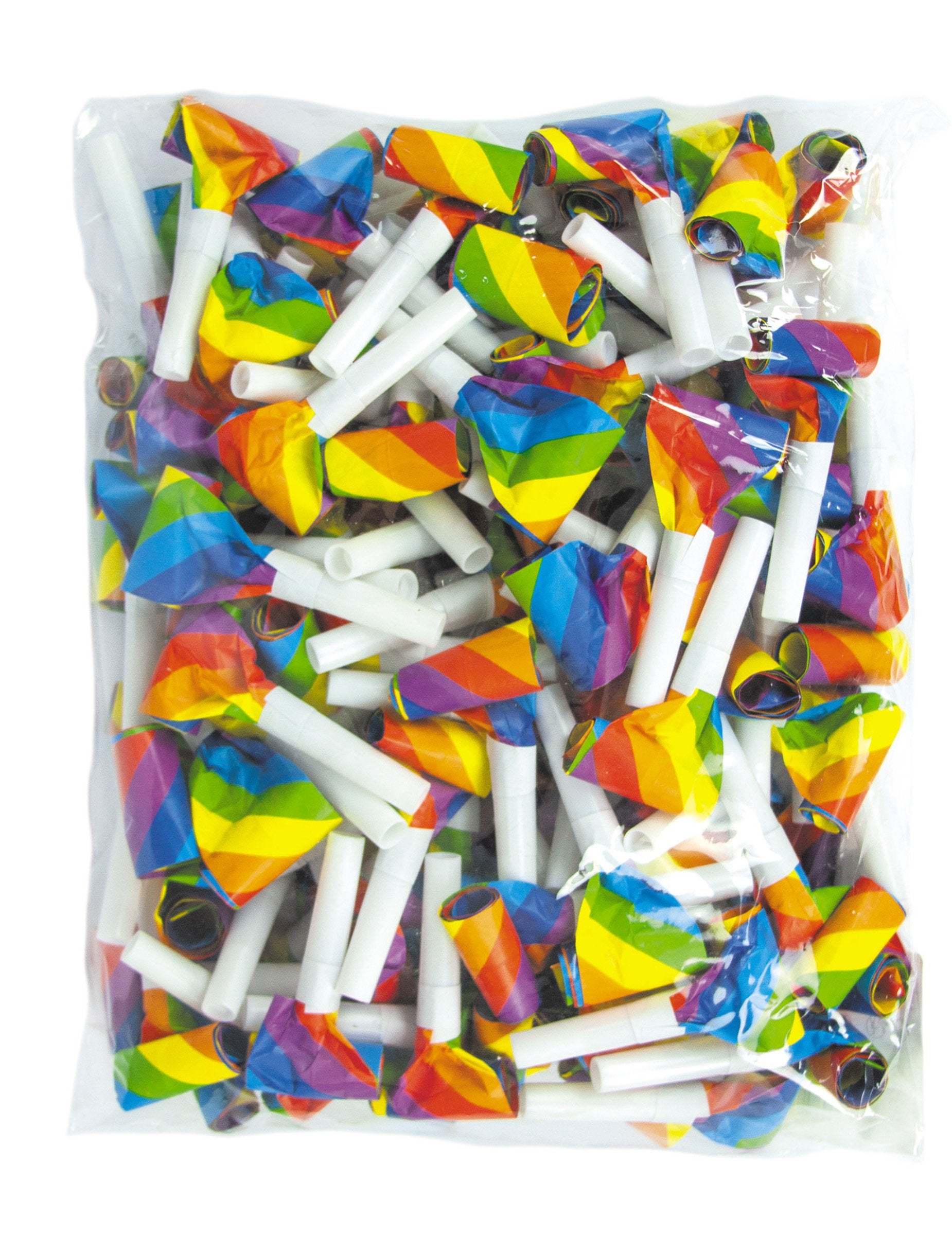 Тези цветни чехли се предлагат в опаковки от 100. Духайте в дръжката, за да създадете шум и да оживите партито си. Перфектен за рожден ден или новогодишно парти.