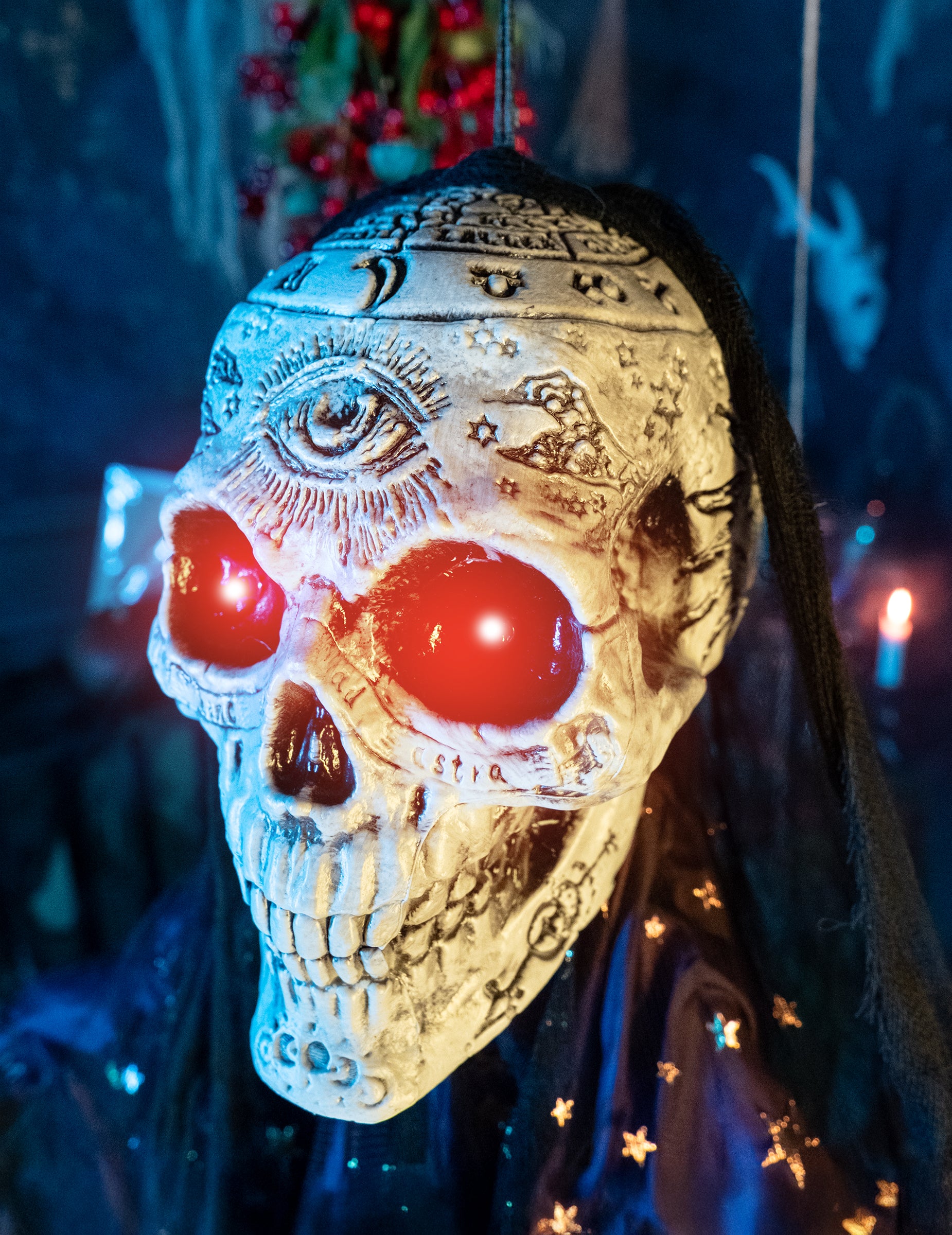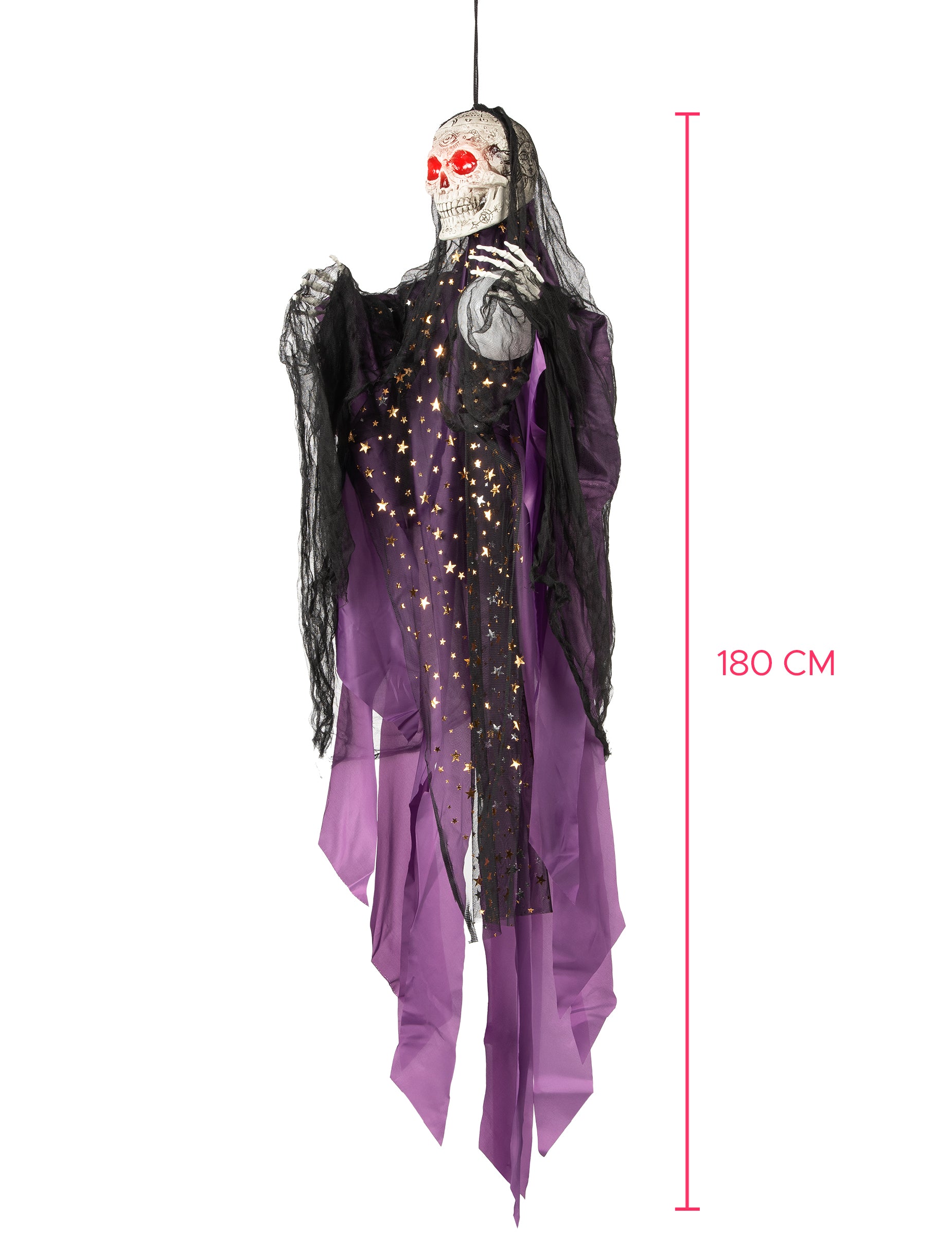 Този скелет от ярък и звуков ясновидник е висок 180 см. Тази висяща декорация представлява скелета на ясновидски, драпиран с черен и лилав воал, декориран със звездни шарки. Черепът му е гравиран с мистериозни символи, предизвиквайки магии, способни да замразят кръвта ви. За да запалите скелета, просто превключете превключвателя и той ще оживее при най -малкия шум. Ключовият ще се подиграе, очите й ще светят в червено и мигащи, докато кристалната й топка ще свети, за да разкрие бъдещето ви. Работи с 3 батерии AAA (батериите не са включени). Тази декорация ще бъде идеална за тероризиране на минувачите -по време на Хелоуин вечер.