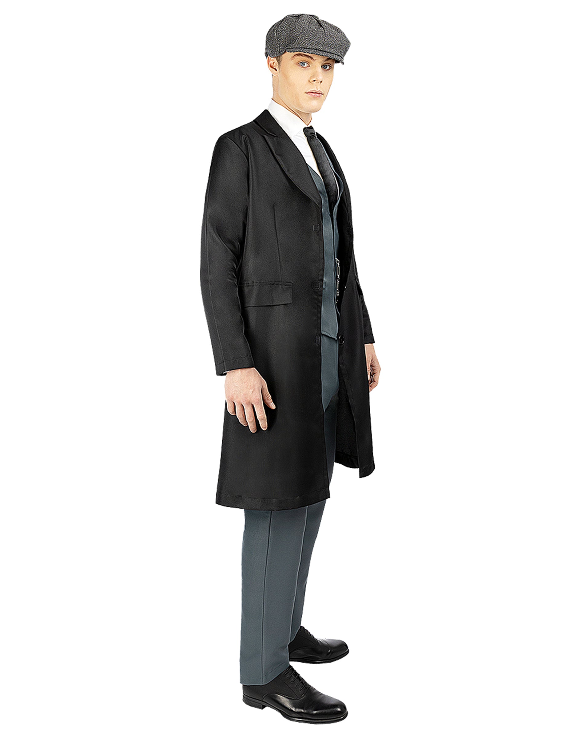 Този мъжки костюм на Tommy Shelby, официално лицензиран от Peaky Blinders, перфектно улавя елегантния и внушителен стил на 20-те години на миналия век, съчетан с класическа жилетка с копчета, създавайки изискан и вечен външен вид. Дългото черно сако добавя нотка изтънченост, напомняйки за дискретната и авторитетна елегантност на известния лидер на Peaky Blinders. Облеклото е завършено от черна вратовръзка, осигуряваща официален завършек, и кръгли очила, предизвикващи интелигентността и пресметливостта на героя. И накрая, сивата плоска шапка, емблематичен аксесоар, придава характерния вид на Томи Шелби. Този костюм на Томи Шелби ще бъде перфектен за тържества в края на годината, Хелоуин или Карнавал.