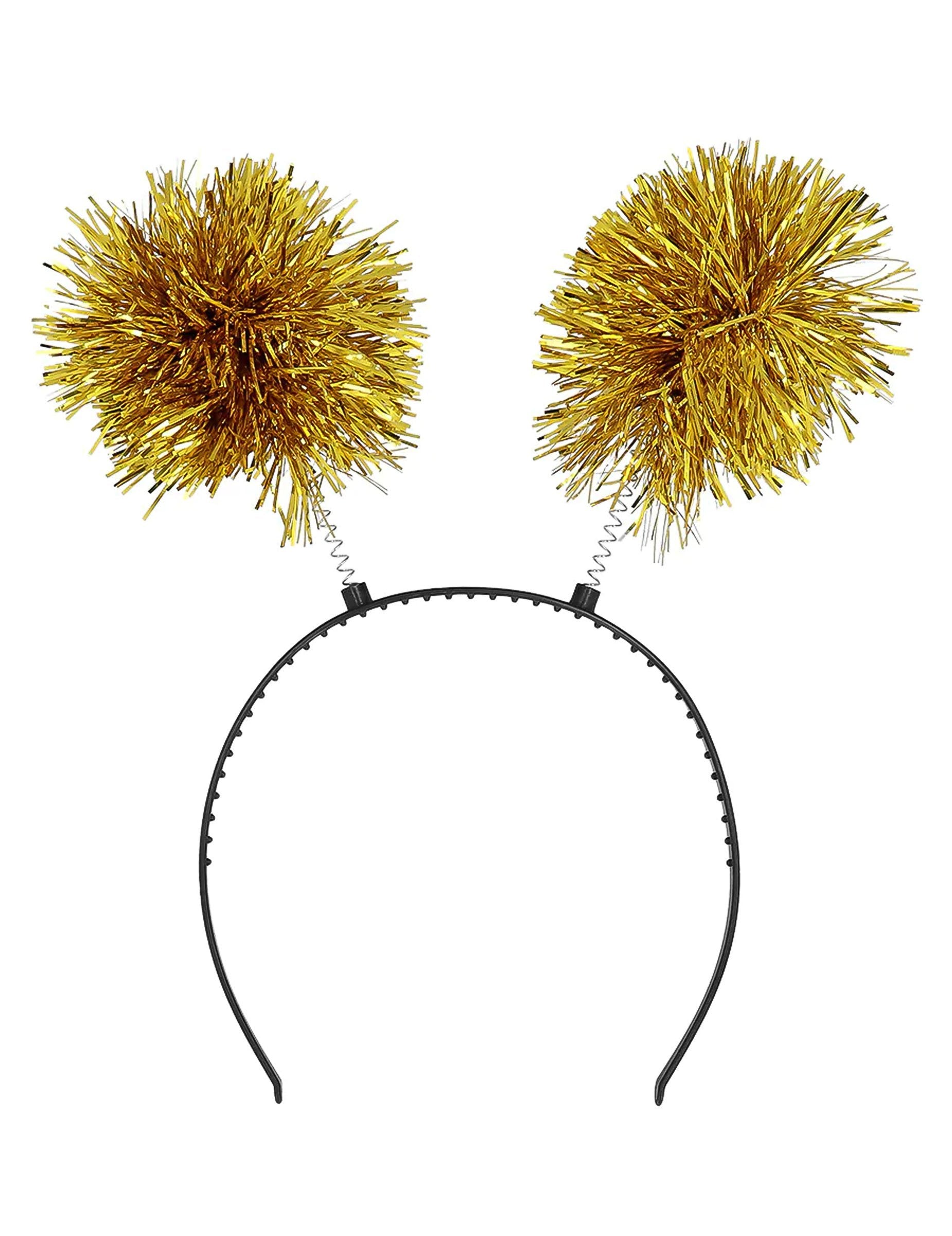 Тази златна лента за глава с помпон е за възрастни. Декориран е с два златни помпона, монтирани на пружини, създаващи искрящ и празничен ефект на движение. Черната лента за глава, дискретна и елегантна, се приспособява удобно към всяка глава. Този аксесоар ще бъде идеален за освежаване на вечер с приятели или за празнуване на Нова година със стил.