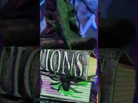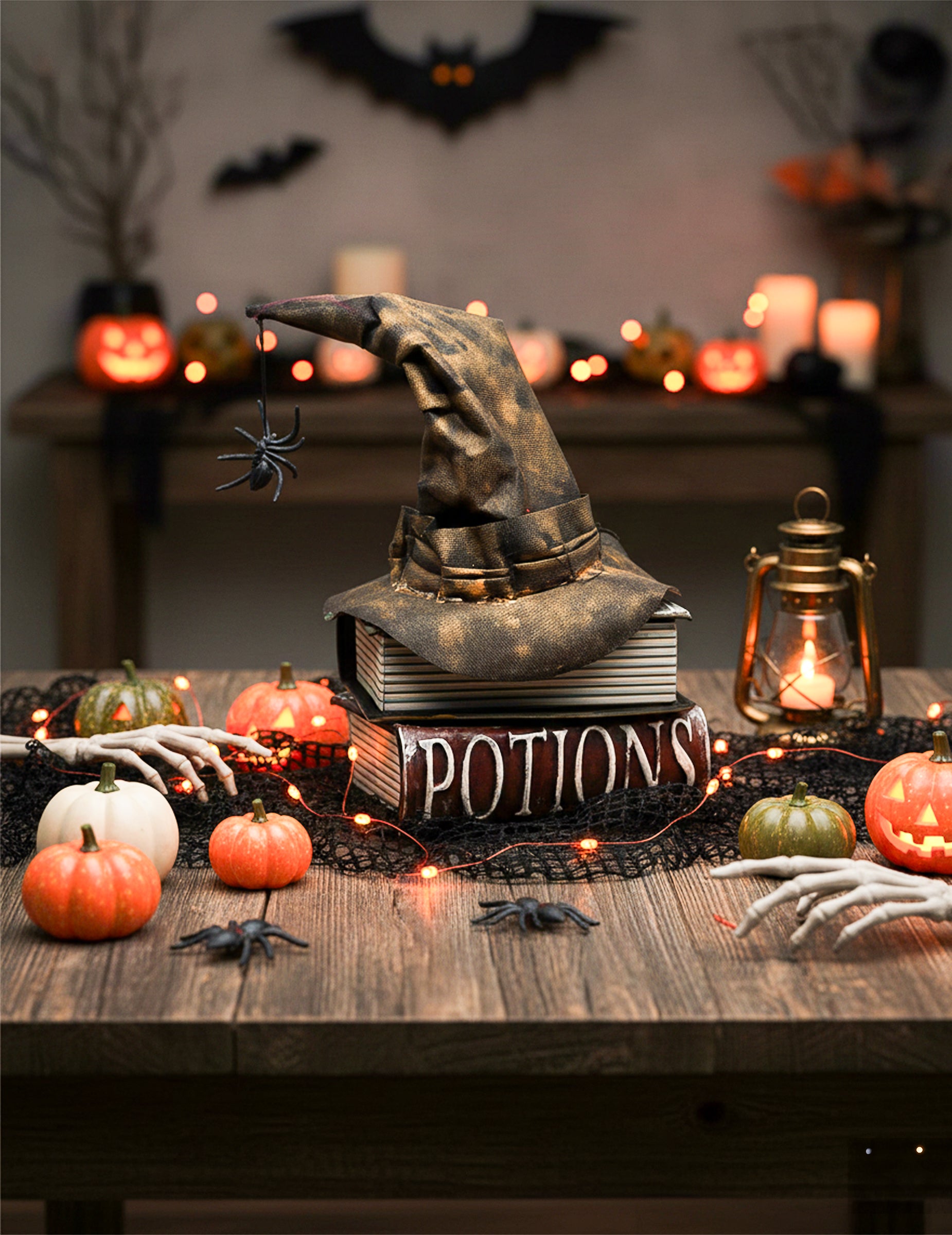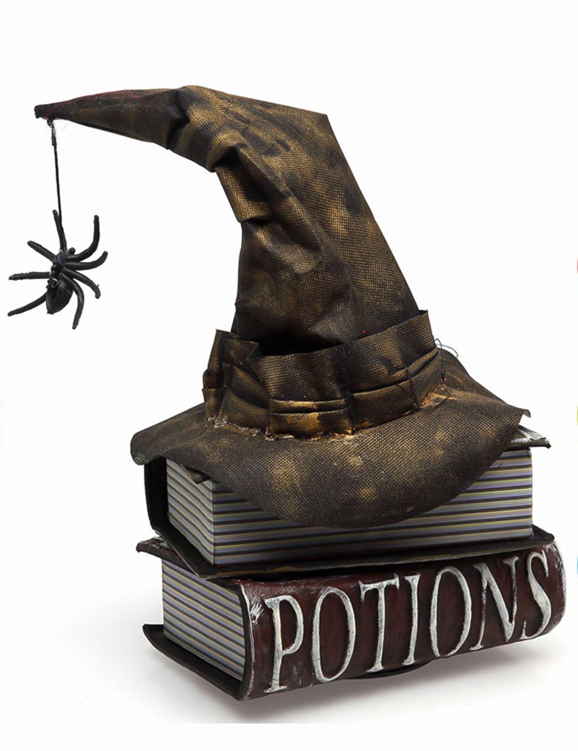 Мистериозните гримоари, увенчани със стара вещическа шапка, която се движи, придружена от вещически звукови ефекти на писъци, и висящ паяк, добавят щрих. мистичен на вашата маса или бюфет. Един светлинен ефект зеленото придава на цялото нещо ярък блясък завладяващусилвайки магическата и обезпокоителна атмосфера.