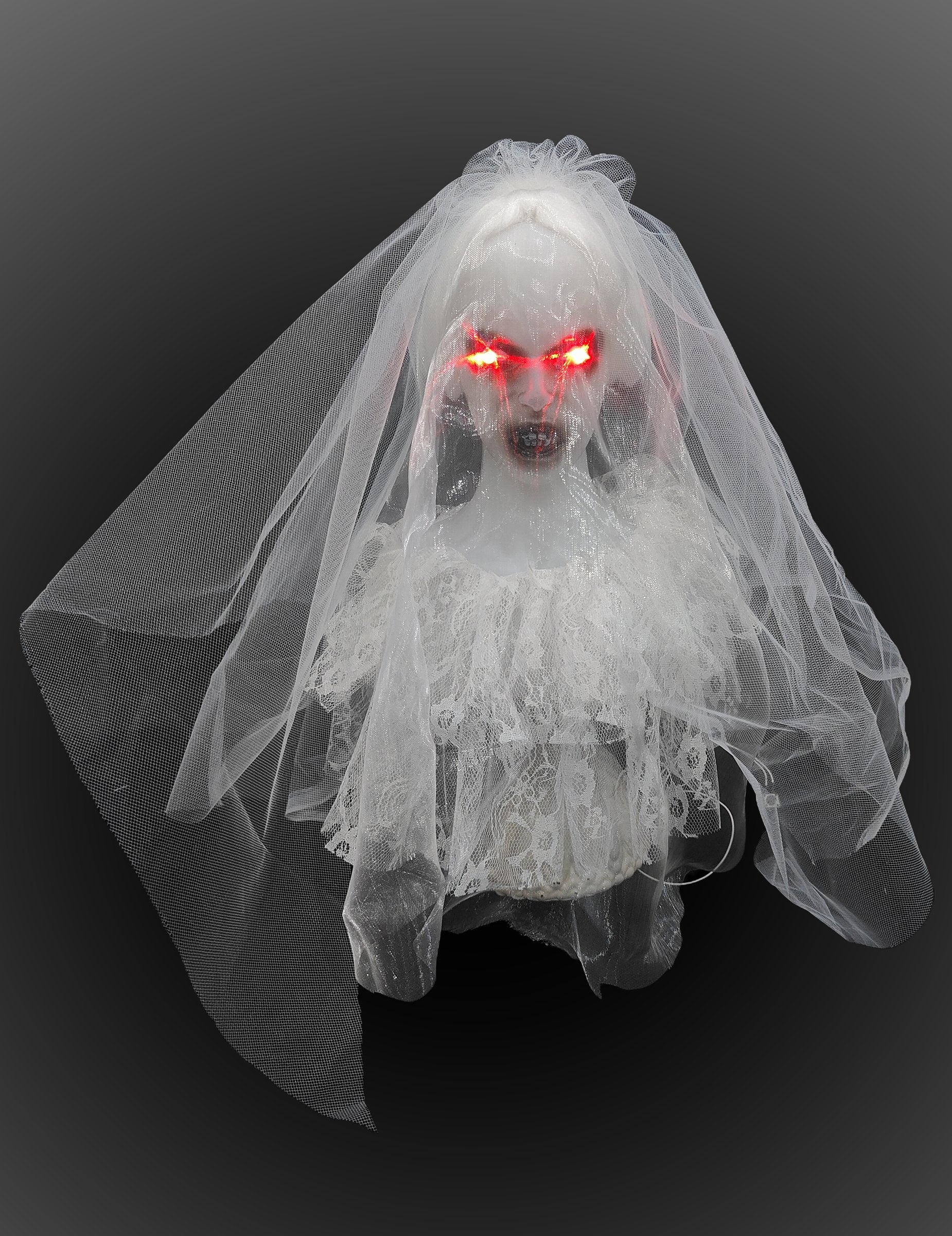 Avec ses voilages blancs et son visage blême, cette mariée fantôme de table de 40 cm semble figée entre deux mondes. Ses yeux rouges lumineux percent l’obscurité dès qu’un bruit se fait entendre, accompagnés d’un hurlement angoissant. Placée sur un buffet ou une console, elle offre un effet glaçant garanti dans un petit format facile à intégrer dans votre déco. Fonctionne avec 3 piles AAA (non incluses). Un choix parfait pour créer une ambiance macabre en intérieur.