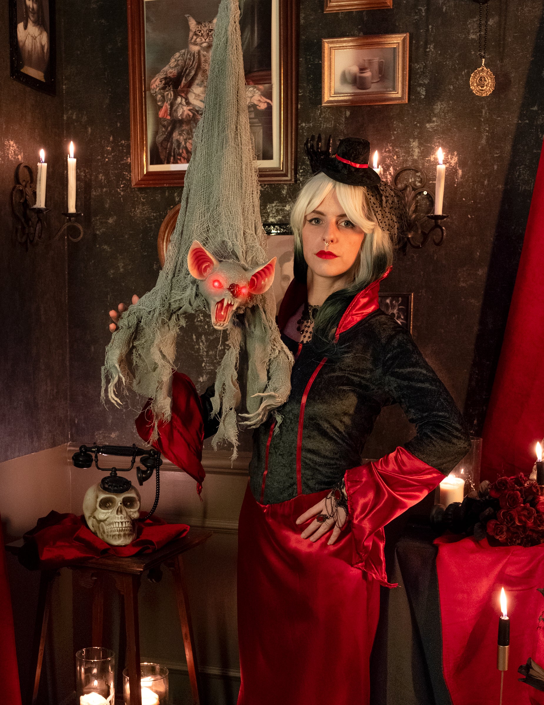 Този анимиран прилеп от 100 cm Тази фигурка привлича вниманието с разкъсаното си тяло, стърчащите си уши и светещите червени очи. Окачена с главата надолу, тя оживява веднага щом се засече звук: главата ѝ започва да се движи, ръцете ѝ трептят и избухва ужасяващ писък. Износеният ѝ вид и резките ѝ движения я правят идеална за поразителен визуален ефект, независимо дали е на закрито или на входа на заведение. Изисква 3 батерии тип AA (включени). Идеална за окачена хорър сцена.