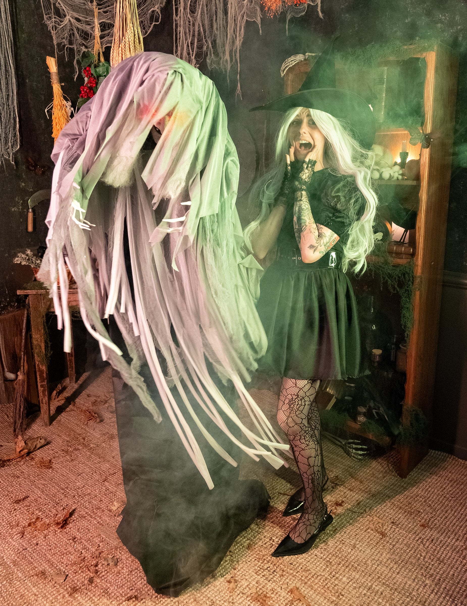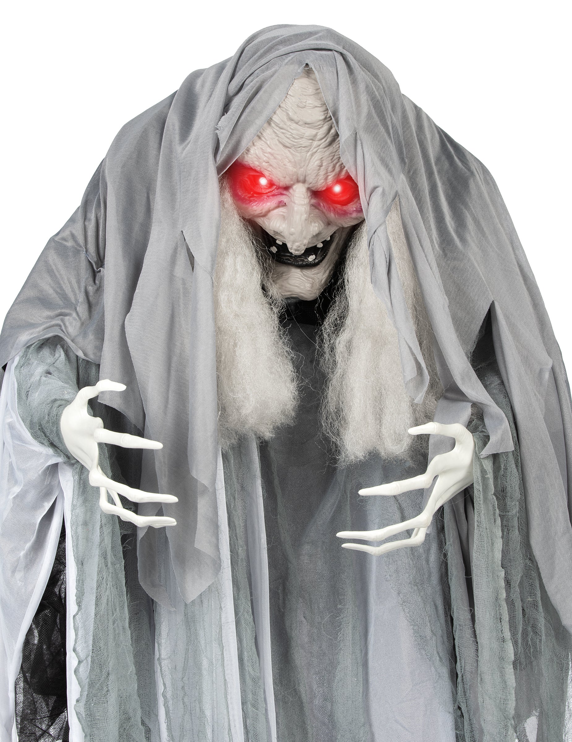 Със силуета си, забулен в черно и сиво, тази Анимирана Вещица от 160 cm Тази фигурка предлага ужасяваща визия. Пронизващият ѝ поглед, кокалести нокти и разкъсано наметало съживяват кошмар наяве. Веднага щом засече звук, тя се задейства, червените ѝ очи светят и избухва смразяващ писък, потапяйки въздуха в тръпки. Работи с 3 включени батерии тип AA и е незаменимо допълнение към всяка зловеща декорация за Хелоуин.