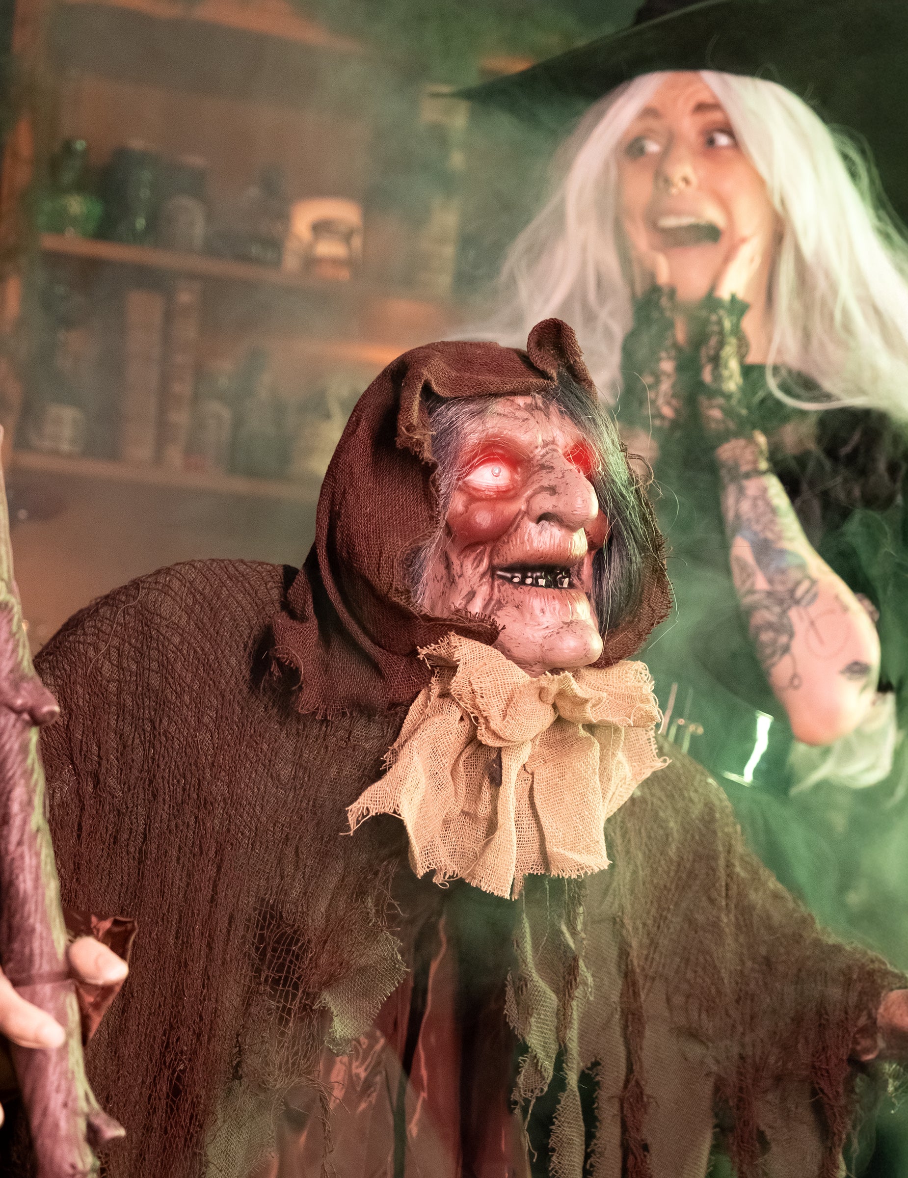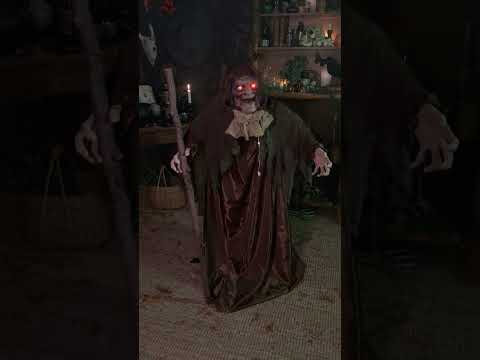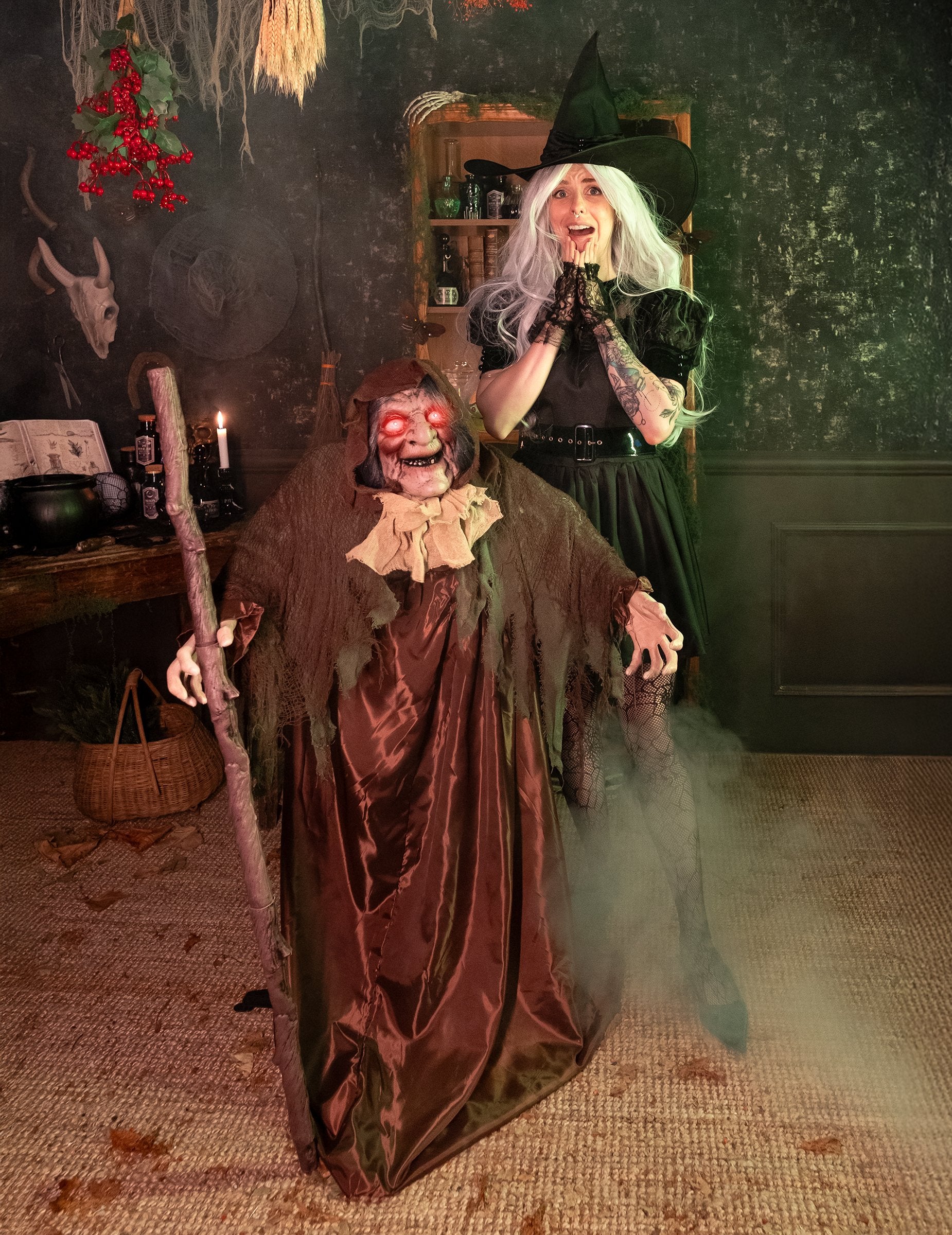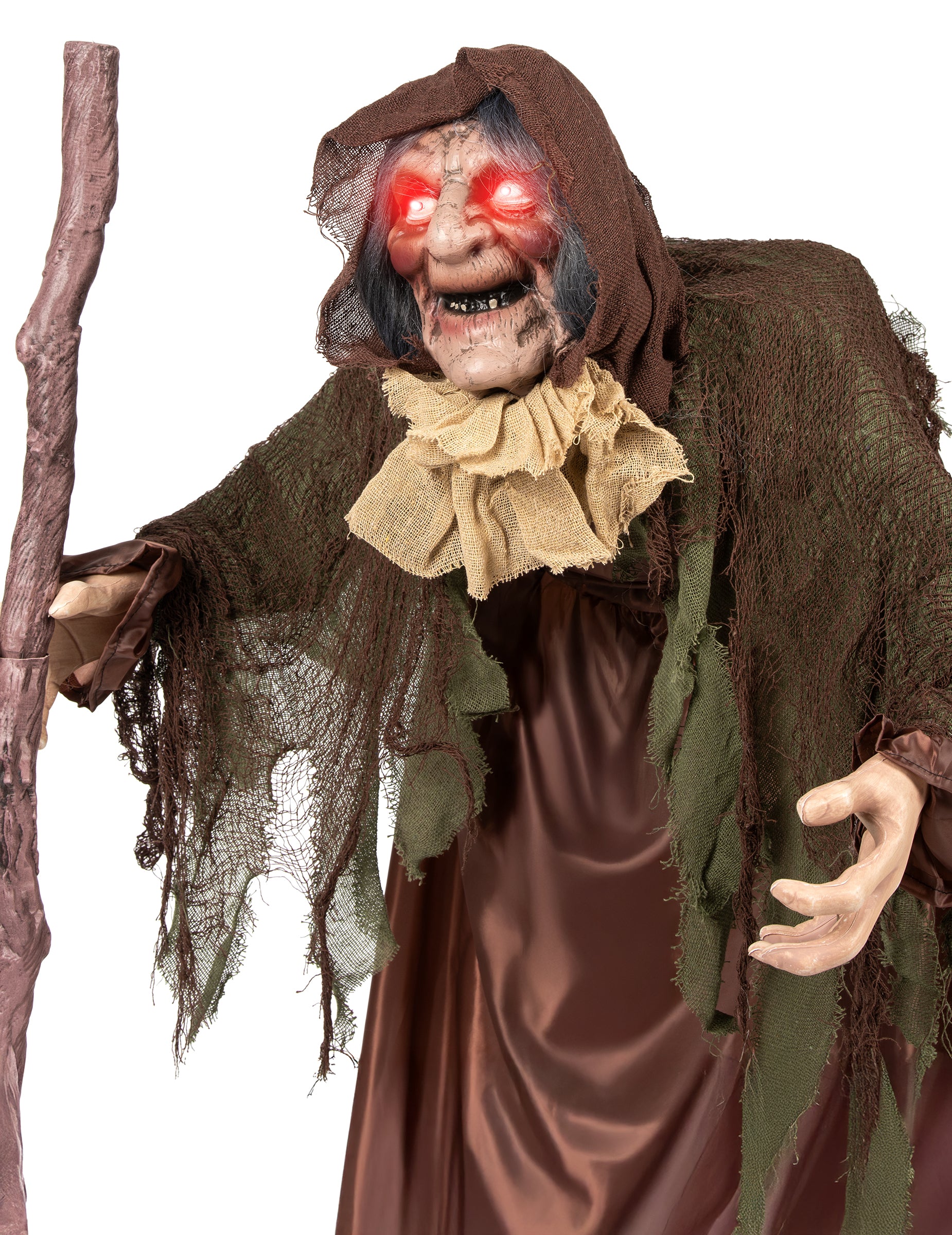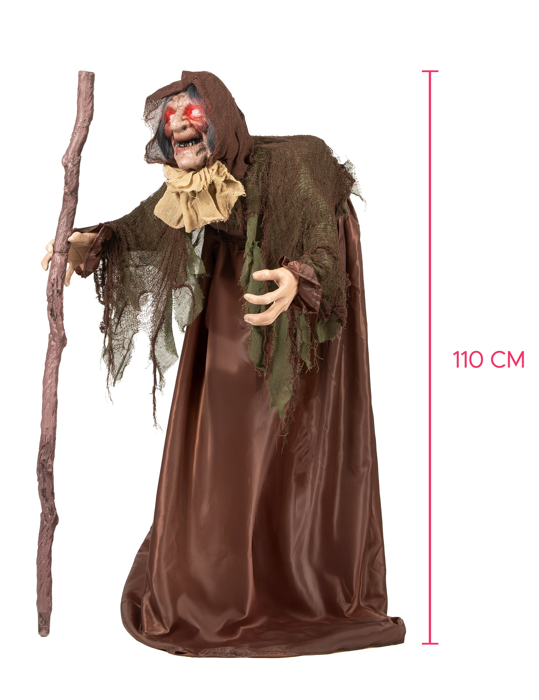 Старата анимирана вещица излъчва смущаваща атмосфера. Пронизващият му поглед, изкривените черти и прегърнатият силует предизвикват образувание, забравено от векове. Той е с размери 50 x 110 cm. Облечена в палто с конец и облечена в качулка с конец, тя напредва трепереща, поддържана от усукана дървена пръчка. Когато звук го предупреждава, очите му светят и звучи зловещо ръмжене. Той работи на 3 батерии AA (не са включени) и е ужасяващо допълнение към вашите тематични партита или декор за Хелоуин.