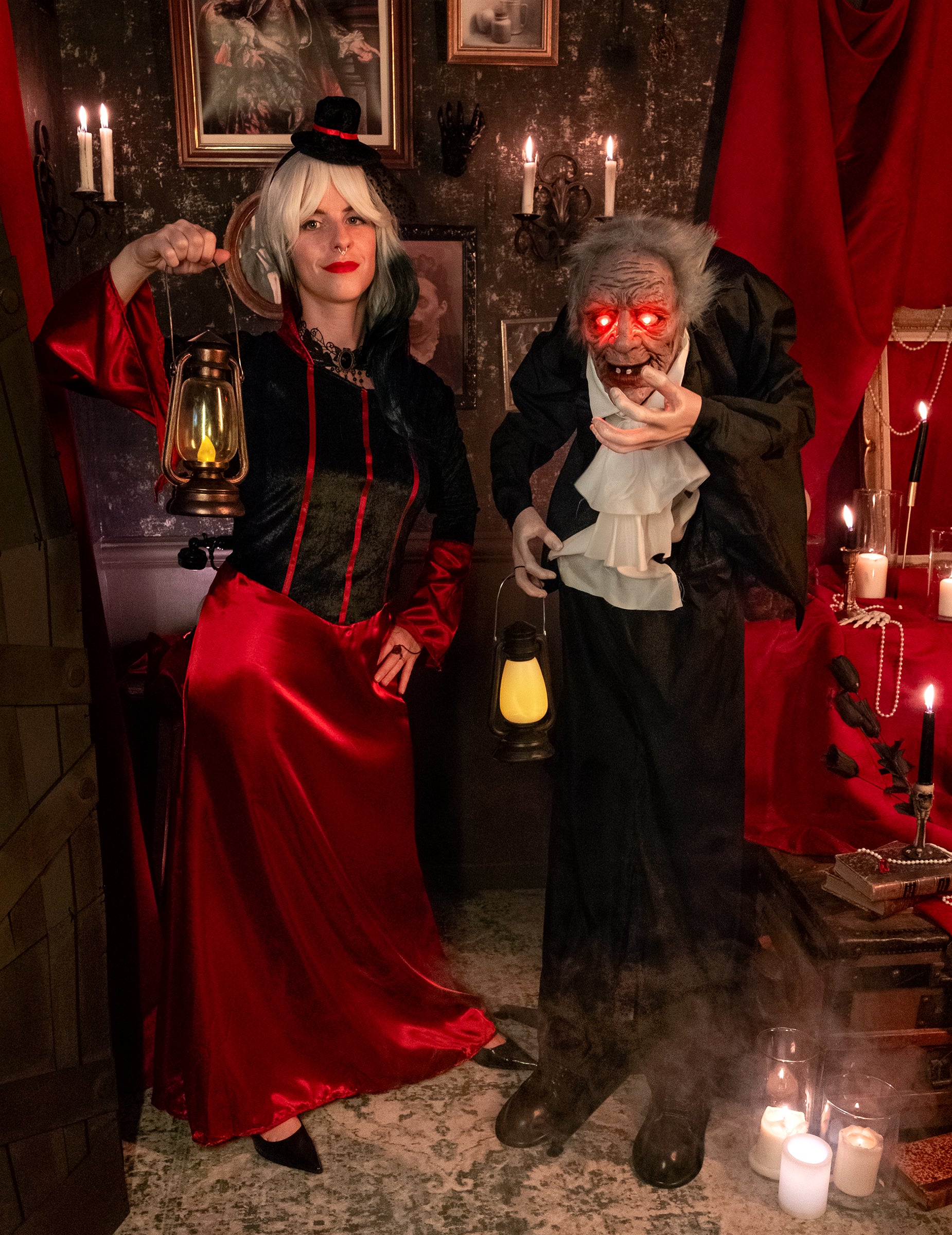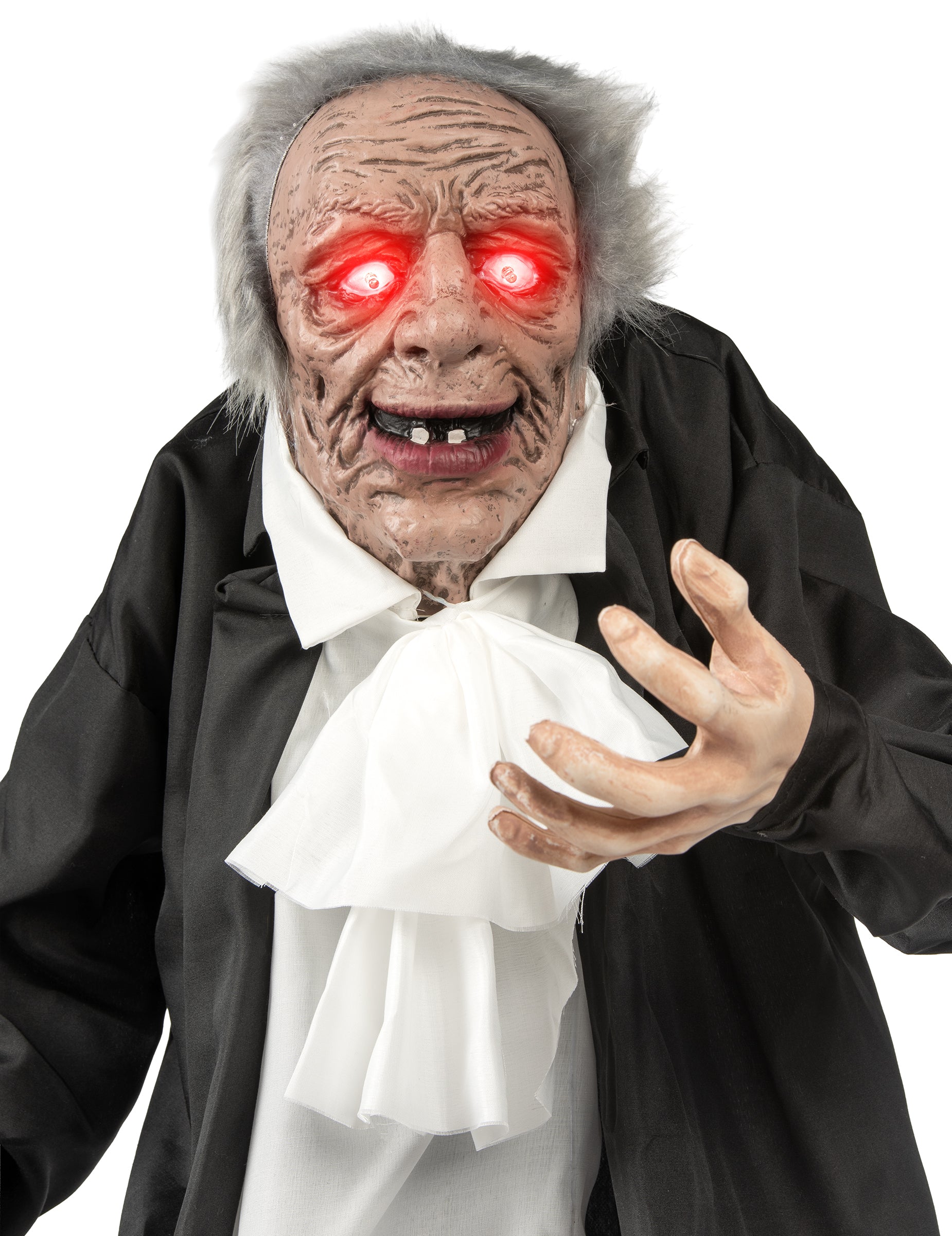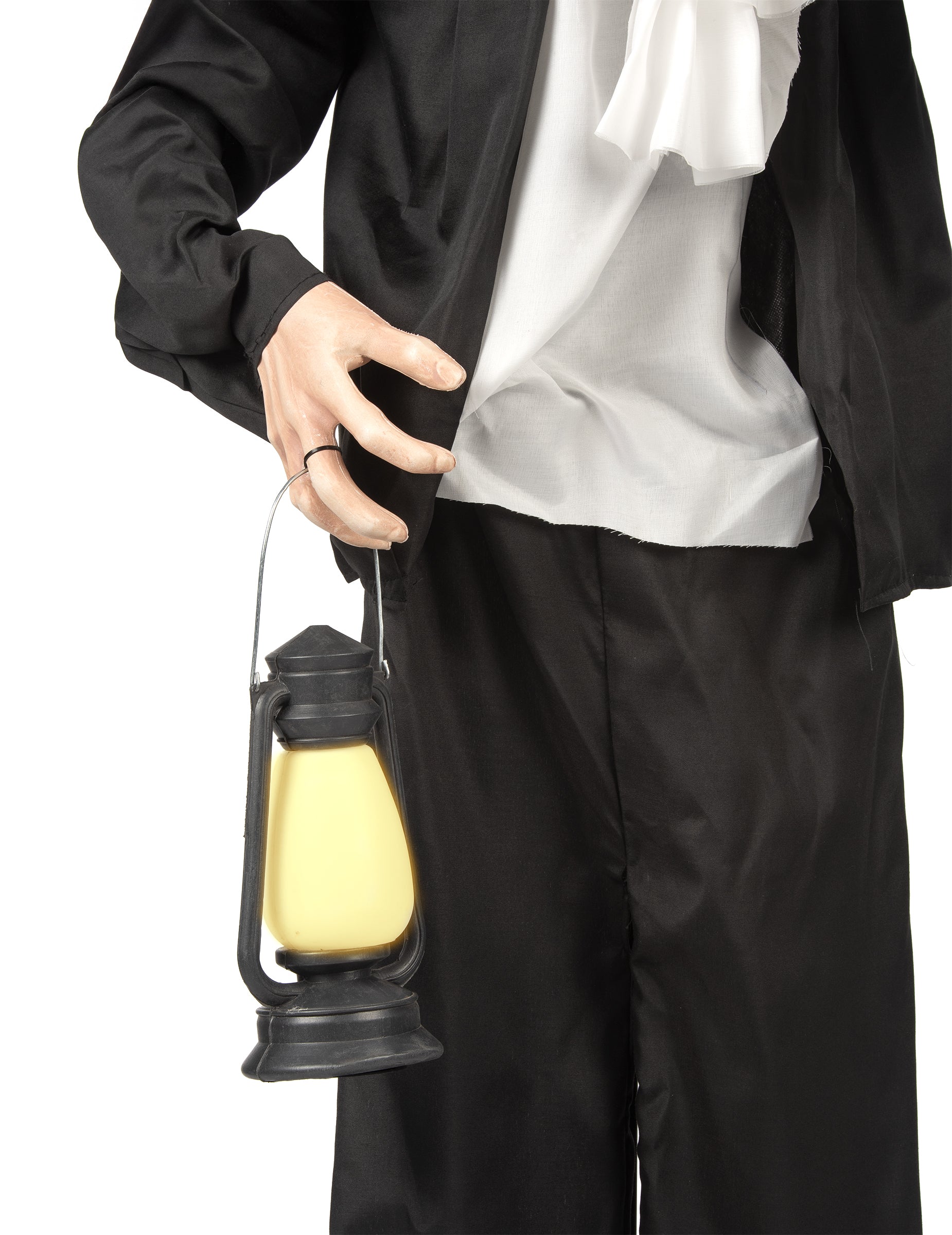 Този прокълнат пазител с фенер, 158 x 120 cm, Създава обезпокоителното усещане за бдителност над изоставено място. Тревожното му лице, уморените черти и прегърбената му стойка веднага вдъхват недоверие. Облечена в тъмни дрехи, контрастиращи с разрошена риза, тя размахва мрачен фенер, готов да светне. Когато се чуе шум, избухва зловещ вик, сякаш проклятие е събудено. Батериите, включени във фигурката и нейната лампа, са идеални за активиране на това зловещо присъствие, перфектно за завладяващо и ужасяващо представление.