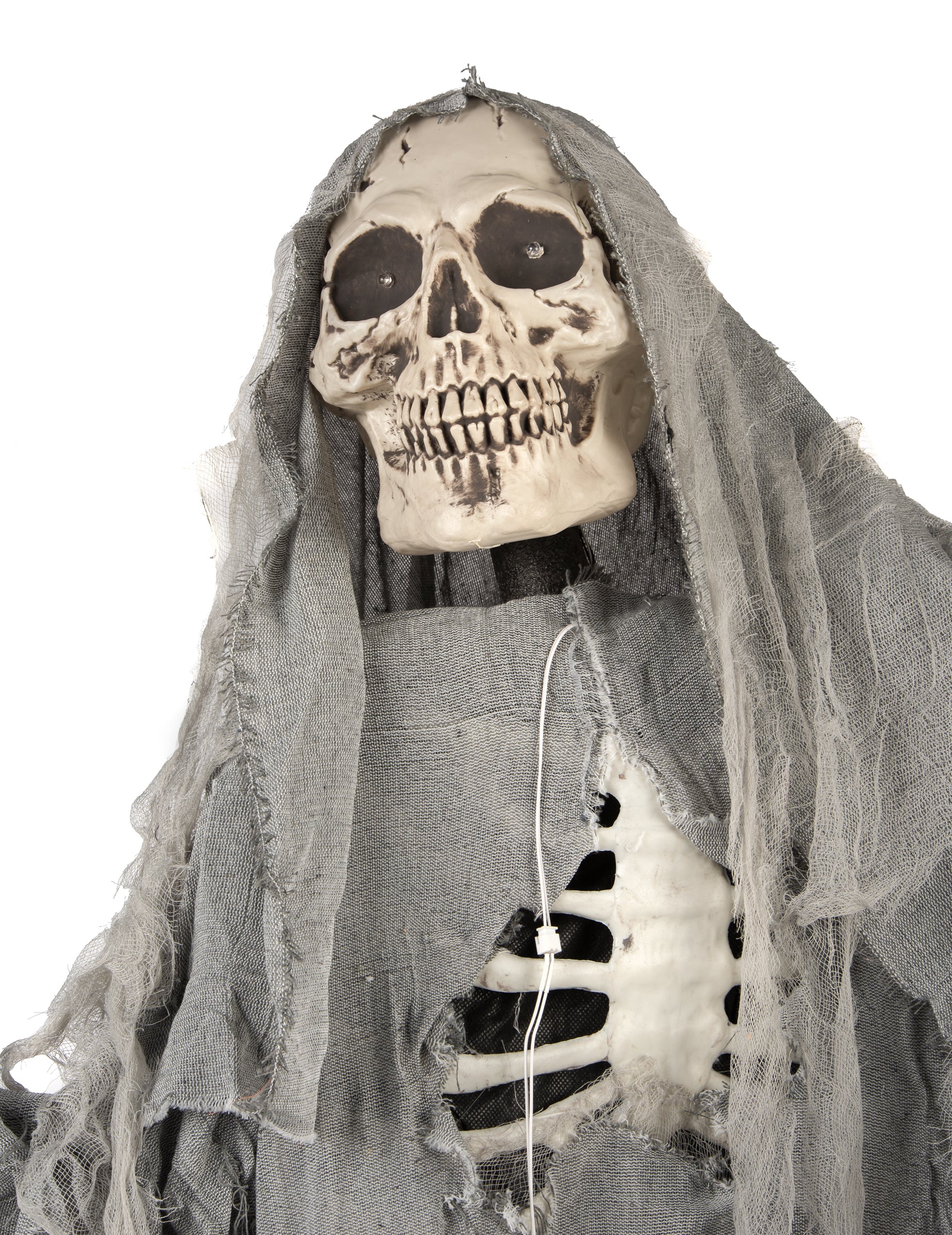 Със своите 183 cm Изправен високо, Зловещият Летящ Жътвар привлича вниманието. Обвит в дрипави сиви воали и размахващ внушителна черна коса, той създава илюзията за дух, реещ се във въздуха, готов да удари. При най-малкия звук главата му оживява, червените му очи светват и изригва зловещ писък. Активира се с превключвател, който го поставя в режим на готовност с едно просто щракване. Декорацията работи с 3 батерии тип AA (включени). Поставете я в коридор или тъмен ъгъл, за да създадете поразителна атмосфера всеки път, когато някой мине. (3 батерии тип AA са включени)