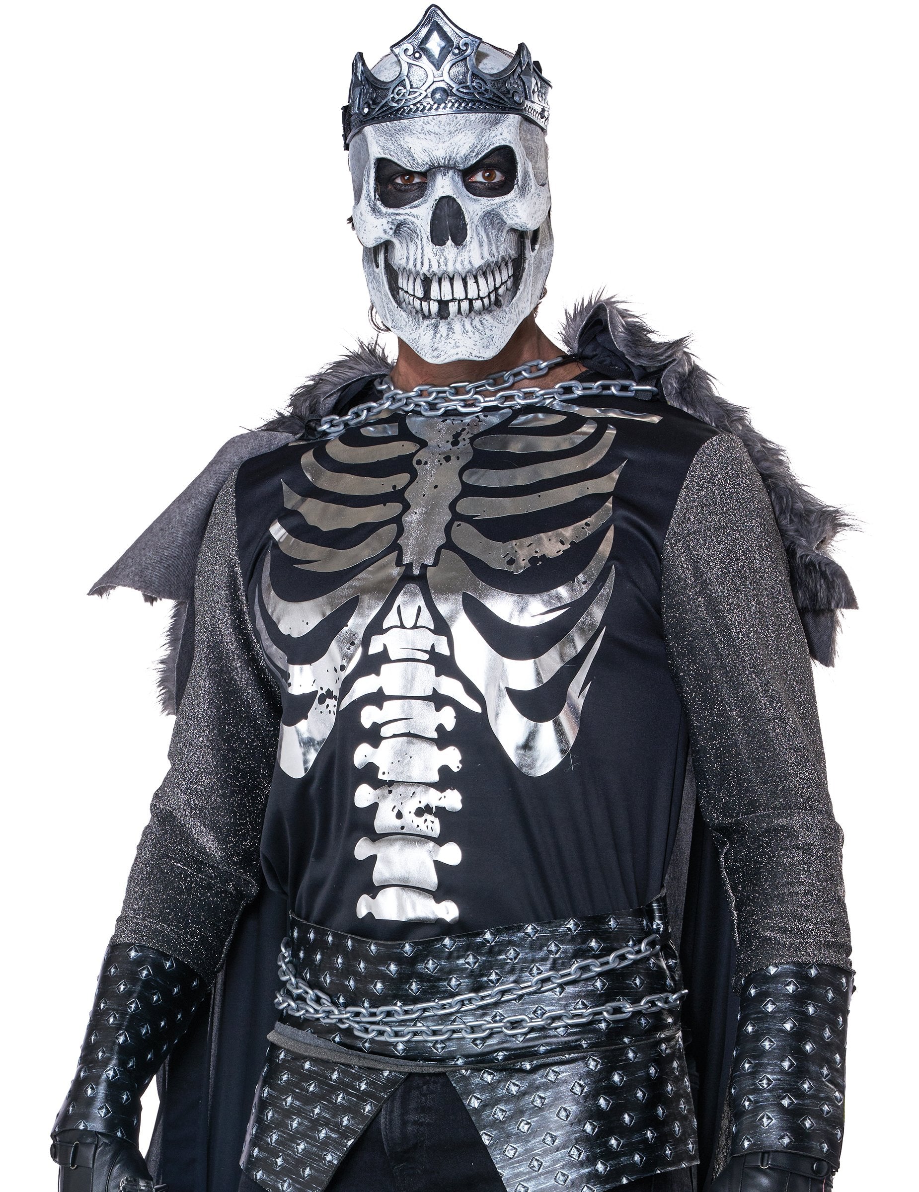 Ce déguisement majestueux et terrifiant vous transforme en un seigneur des ombres, prêt à régner sur l’armée des damnés. Ce déguisement comprend un haut noir orné d’un imprimé argenté représentant un squelette, créant l’illusion d’un torse spectral. Une ceinture à clous métalliques ainsi qu’une paire de manchettes assorties, reprenant les motifs de la ceinture, viennent renforcer le caractère guerrier de cette tenue. La cape longue bordée de fausse fourrure apporte une prestance royale et une allure imposante, tandis que le masque de crâne détaillé avec sa couronne ornée parachève cette transformation macabre. Idéal pour Halloween, une soirée médiévale fantastique, ce costume garantit une apparence effrayante et charismatique. Associez-le à une épée imposante et des gants noirs pour incarner un véritable roi des morts légendaire !