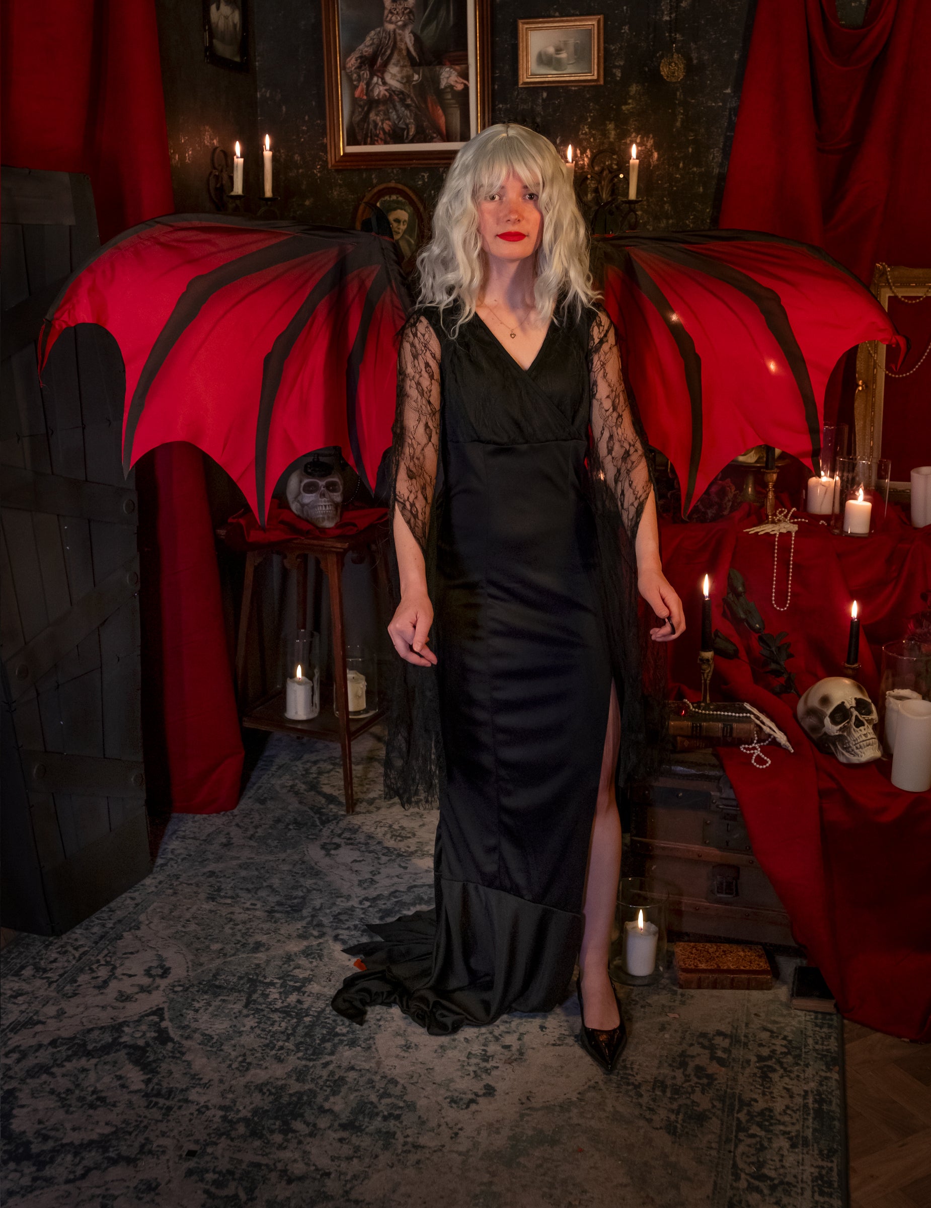 Тези гигантски крила за възрастни се похвалят с впечатляващ размах на крилата от приблизително 170 cm, Идеален за инфернална трансформация. Със своя червен и черен градиент, тяхната оребрена конструкция и острата им форма, те носят мощно и мистично докосване на вашето облекло. Лесни за носене, те се държат на място с каишки, гарантирайки добра подкрепа през цялата вечер. Пръстените се поставят около пръстите, което ви позволява да удължите крилата, като издърпате леко навън за поразителен и потапящ визуален ефект. Перфектен за Хелоуин, косплей или свирене на демонично същество със стил!