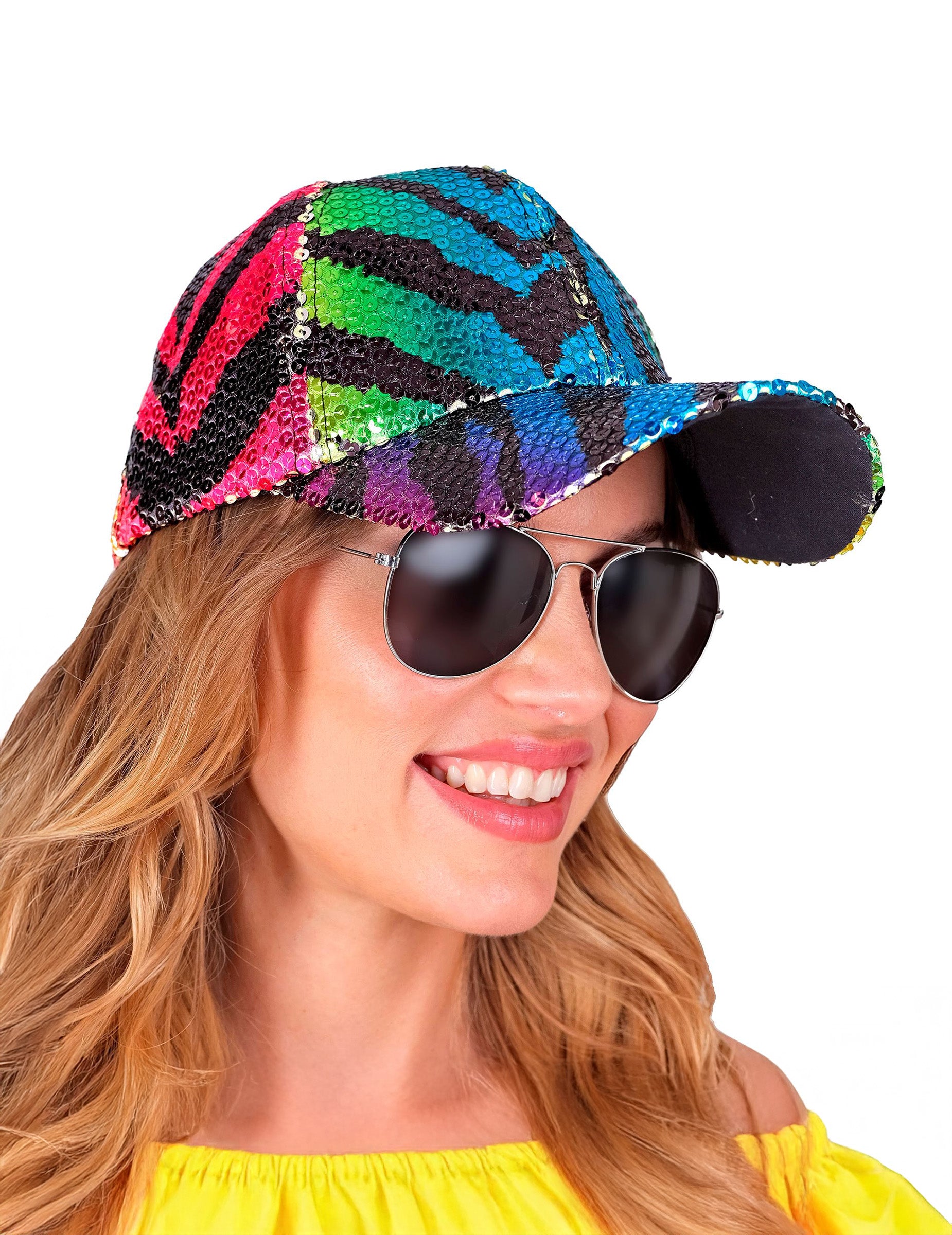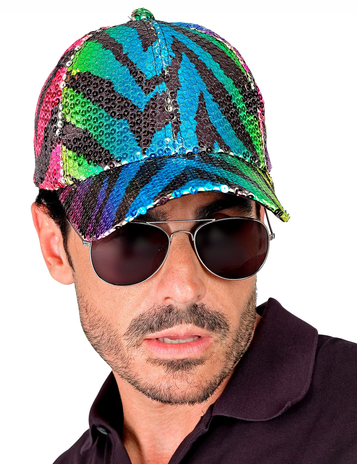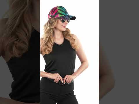 Лека и удобна, тя е изцяло покрита с блестящи пайети които улавят светлината и подчертават нейния отпечатък цветна тигрова ивица, съчетаваща ярки нюанси като зелено, розово и синьо. Дизайнът му е допълнен от извита козирка, идеална за стил, който е едновременно оригинален и небрежен.