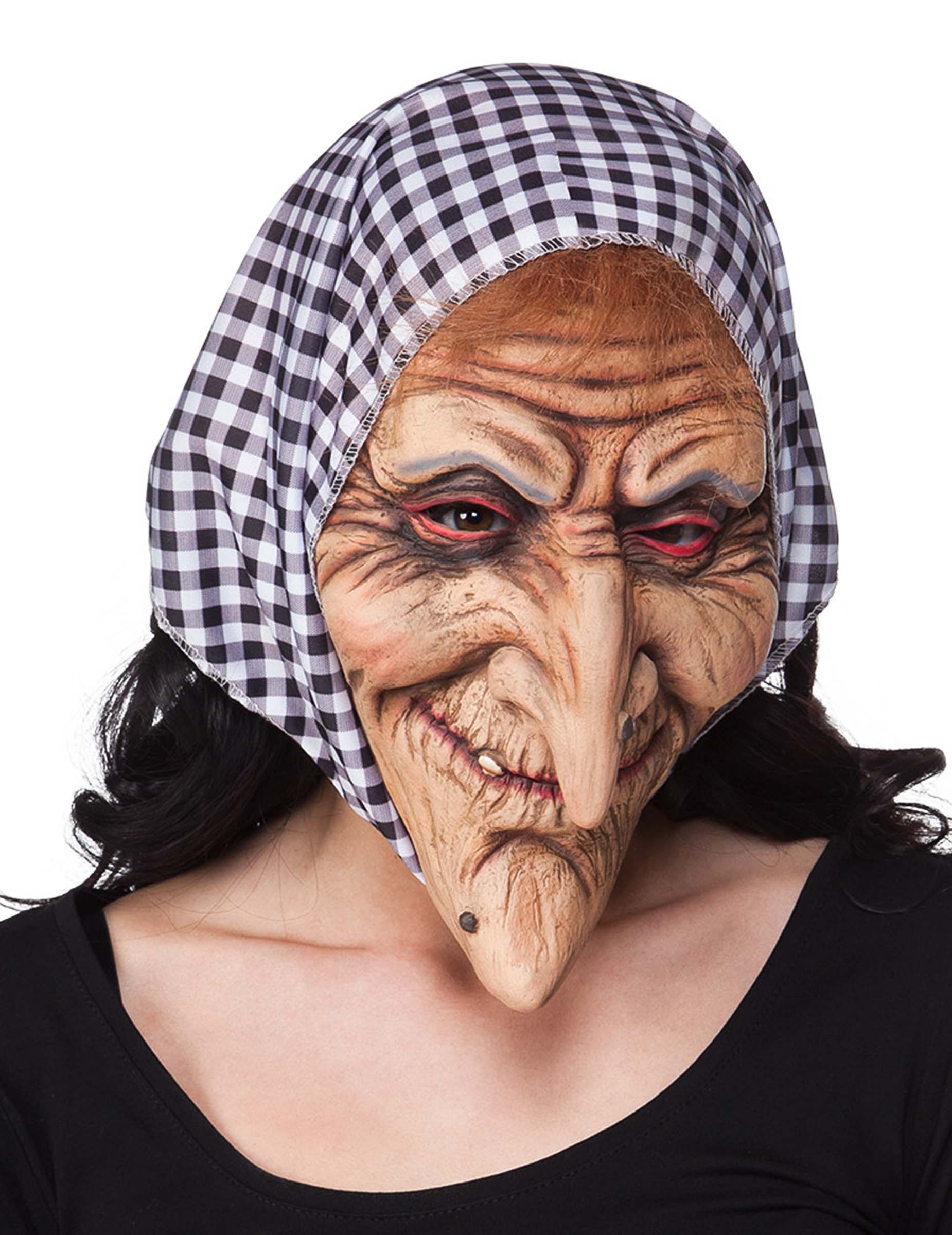 Тази стара вещическа маска за възрастни е перфектният аксесоар за Хелоуин костюм или тематично парти. Изработена от мек латекс, тя изобразява набръчкано и изразително лице, с дълъг, закачен нос и зловеща усмивка. Маската е украсена с черно-бял кариран шал, пришит директно върху главата, добавяйки рустик щрих. Лесна за поставяне, тя покрива изцяло лицето за завладяващ вид, като същевременно позволява добра свобода на движение. Перфектна за въплъщение на вещица в традиционен стил и за създаване на трайно впечатление.