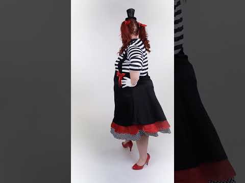 Този дамски карнавален костюм на мим в голям размер се състои от черна и червена рокля и подходяща папийонка.