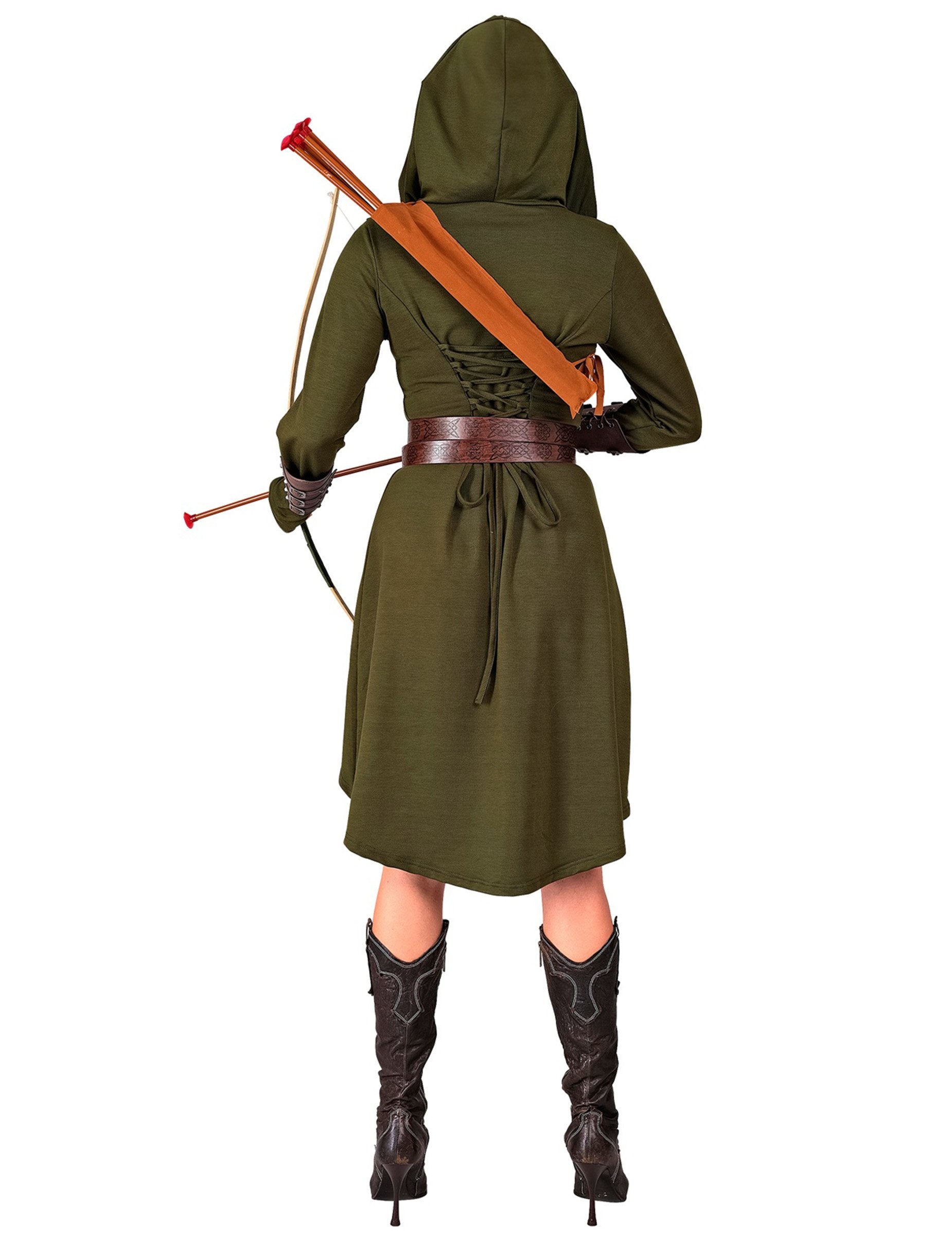 Тази зелена готическа средновековна рокля за жени се състои от вградена рокля с качулка, идеална за превъплъщение в стрелкиня или легендарна авантюристка.